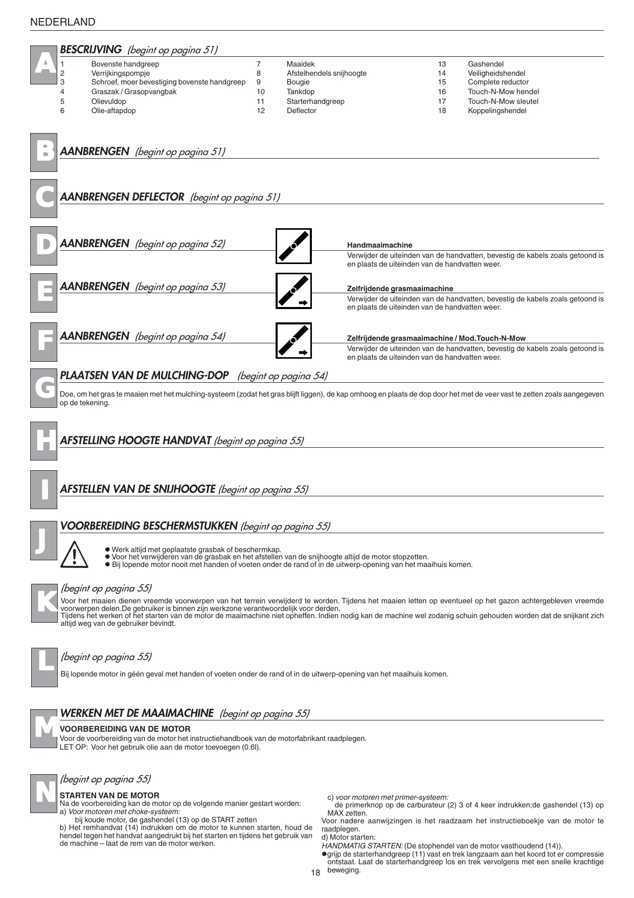 VOORBEREIDING BESCHERMSTUKKEN (begint op pagina 55) l Werk altijd met geplaatste grasbak of beschermkap. l Voor het verwijderen van de grasbak en het afstellen van de snijhoogte altijd de motor stopzetten. l Bij lopende motor nooit met handen of voeten onder de rand of in de uitwerp-opening van het maaihuis komen. (begint op pagina 55) Voor het maaien dienen vreemde voorwerpen van het terrein verwijderd te worden. Tijdens het maaien letten op eventueel op het gazon achtergebleven vreemde voorwerpen delen.De gebruiker is binnen zijn werkzone verantwoordelijk voor derden. Tijdens het werken of het starten van de motor de maaimachine niet opheffen. Indien nodig kan de machine wel zodanig schuin gehouden worden dat de snijkant zich altijd weg van de gebruiker bevindt. (begint op pagina 55) Bij lopende motor in géén geval met handen of voeten onder de rand of in de uitwerp-opening van het maaihuis komen. WERKEN MET DE MAAIMACHINE (begint op pagina 55)