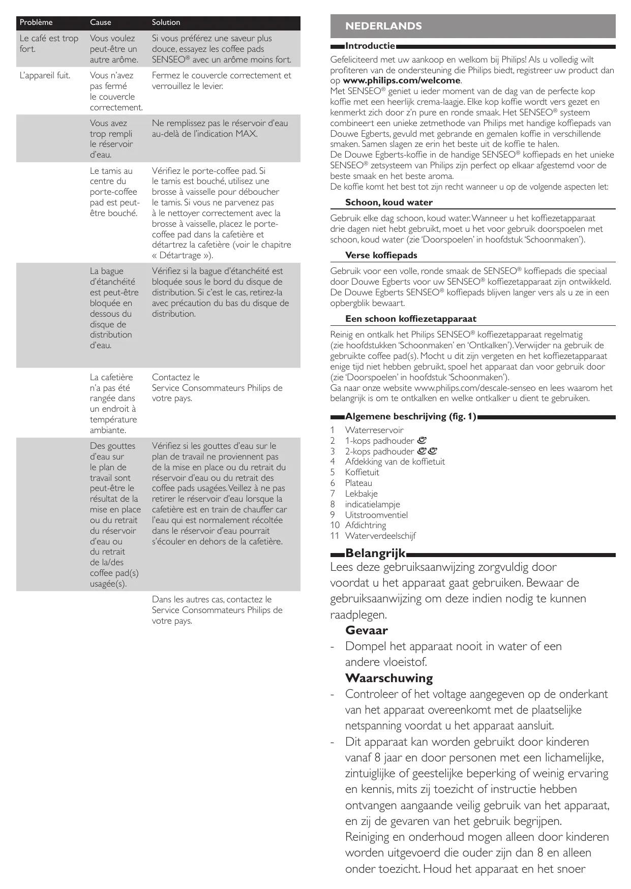 Algemene beschrijving (fig. 1) Waterreservoir 1-kops padhouder ° 2-kops padhouder °° Afdekking van de koffietuit Koffietuit Plateau Lekbakje indicatielampje Uitstroomventiel Afdichtring Waterverdeelschijf Belangrijk Lees deze gebruiksaanwijzing zorgvuldig door voordat u het apparaat gaat gebruiken. Bewaar de gebruiksaanwijzing om deze indien nodig te kunnen raadplegen. Gevaar -- Dompel het apparaat nooit in water of een andere vloeistof. Waarschuwing -- Controleer of het voltage aangegeven op de onderkant van het apparaat overeenkomt met de plaatselijke netspanning voordat u het apparaat aansluit. -- Dit apparaat kan worden gebruikt door kinderen vanaf 8 jaar en door personen met een lichamelijke, zintuiglijke of geestelijke beperking of weinig ervaring en kennis, mits zij toezicht of instructie hebben ontvangen aangaande veilig gebruik van het apparaat, en zij de gevaren van het gebruik begrijpen. Reiniging en onderhoud mogen alleen door kinderen worden uitgevoerd die ouder zijn dan 8 en alleen onder toezicht. Houd het apparaat en het snoer
