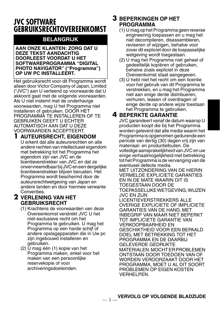 Programme sur votre machine et reste effectif jusqu’à résiliation en vertu de la clause suivante. Si vous violez l’une quelconque des clauses de ce contrat, JVC se réserve le droit de le résilier sans avis préalable. Dans ce cas, JVC est en droit de réclamer réparation pour les dommages causés par cette violation. En cas de résiliation de ce contrat, vous devez immédiatement détruire le Programme stocké sur votre machine (y compris l’effacer de la mémoire de votre ordinateur) et ne plus l’avoir en votre possession.
