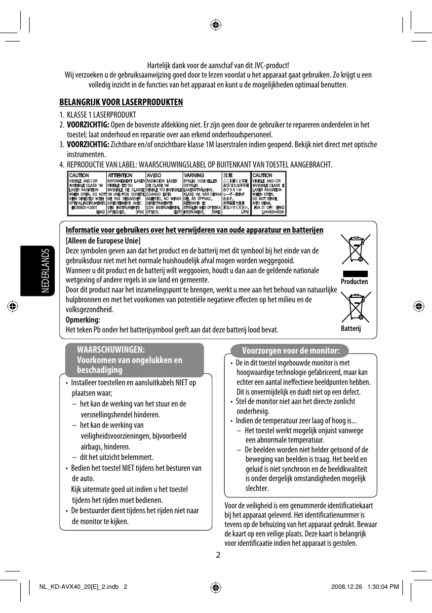 Informatie voor gebruikers over het verwijderen van oude apparatuur en batterijen [Alleen de Europese Unie] Deze symbolen geven aan dat het product en de batterij met dit symbool bij het einde van de gebruiksduur niet met het normale huishoudelijk afval mogen worden weggegooid. Wanneer u dit product en de batterij wilt weggooien, houdt u dan aan de geldende nationale wetgeving of andere regels in uw land en gemeente. Producten Door dit product naar het inzamelingspunt te brengen, werkt u mee aan het behoud van natuurlijke hulpbronnen en met het voorkomen van potentiële negatieve effecten op het milieu en de volksgezondheid. Opmerking: Batterij Het teken Pb onder het batterijsymbool geeft aan dat deze batterij lood bevat. WAARSCHUWINGEN: Voorkomen van ongelukken en beschadiging Voorzorgen voor de monitor: