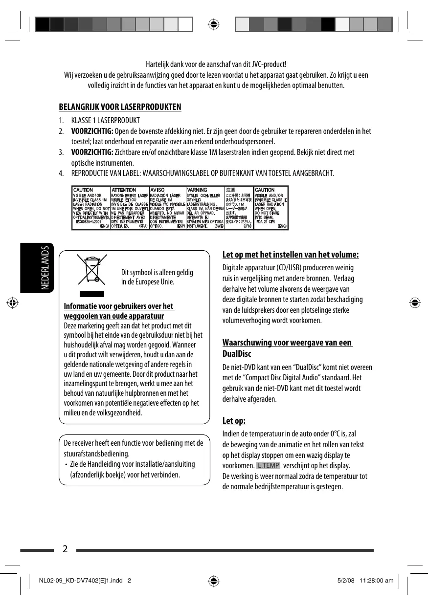 Stel het apparaat terug Zie de pagina met de paragraaf Het apparaat terugstellen Représentant européen de la société Victor Company of Japan, Limited : JVC Technology Centre Europe GmbH Le nom de la compagnie a changé dans: JVC Technical Services Europe GmbH Postfach 10 05 52