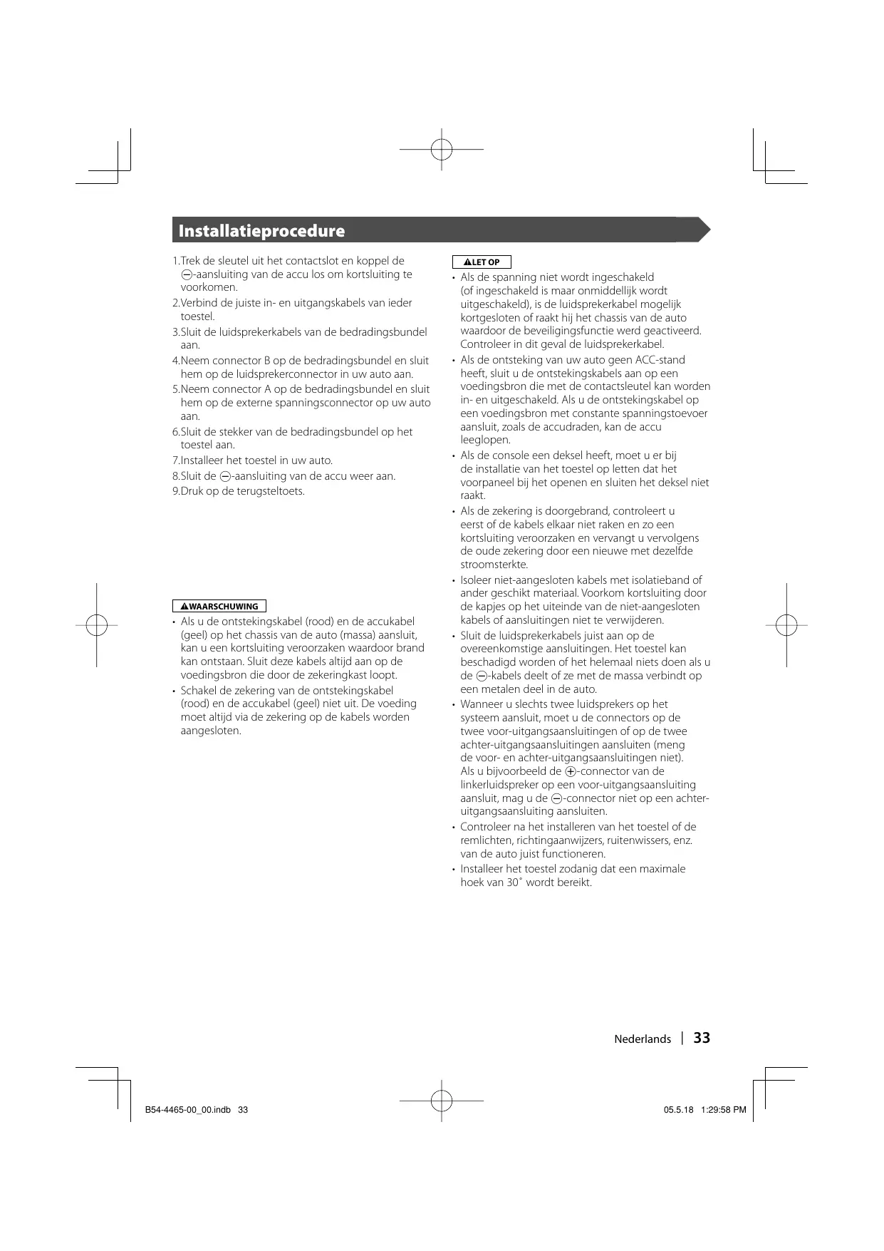 1.Trek de sleutel uit het contactslot en koppel de ©aansluiting van de accu los om kortsiuiting te Voorkomen. 2.Verbind de juiste in- en uitgangskabels van ieder toestel 3.Sluit de luidsprekerkabels van de bedradingsbundel aan 4.Neem connector B op de bedradingsbundel en sluit hem op de luidsprekerconnector in uw auto aan. 5.Neem connector A op de bedradingsbundel en sluit hem op de externe spanningsconnector op uw auto aan 6luit de stekker van de bedradingsbundel op het toestel aan. 7.Installeer het toestel in uw auto. 8.Sluit de ©-aansluiting van de accu weer aan 9.Druk op de terugsteltoets. + AÏs u de ontstekingskabel (rood) en de accukabel geel) op het chassis van de auto (massa) aansluit, Kan u een kortsluiting veroorzaken waardoor brand kan ontstaan. Sluit deze kabels altijd aan op de voedingsbron die door de zekeringkast loopt + Schakel de zekering van de ontstekingskabel {rood) en de accukabel (geel) niet uit. De voeding moet altijd via de zekering op de kabels worden aangesloten. + Al de spanning niet wordt ingeschakeld of ingeschakeld is maar onmiddellijk wordt uitgeschakeld), is de luidsprekerkabel mogelik kortgesloten of raakt hij het chassis van de auto waardoor de beveiligingsfunctie werd geactiveerd Controleer in dit geval de luidsprekerkabel. As de ontsteking van uw auto geen ACC-stand heeft, sluit u de ontstekingskabels aan op een voedingsbron die met de contactsleutel kan worden in- en uitgeschakeld. Als u de ontstekingskabel op een voedingsbron met constante spanningstoevoer aansluit, zoals de accudraden, kan de accu leeglopen. Als de console een deksel heeft, moet u er bij de installatie van het toestel op letten dat het voorpaneel bij het openen en sluiten het deksel niet raakt. As de zekering is doorgebrand, controleert u eerst of de kabels elkaar niet raken en zo een Kortsluiting veroorzaken en vervangt u vervolgens de oude zekering door een nieuwe met dezelfde stroomsterkte. Isoleer niet-aangesloten kabels met isolatieband of ander geschikt materiaal. Voorkom kortsluiting door de kapjes op het uiteinde van de niet-aangesloten kabels of aansluitingen niet te verwiideren. Sluit de luidsprekerkabels juist aan op de overeenkomstige aansluitingen. Het toestel kan beschadigd worden of het helemaal niets doen als u de ©-kabels deelt of ze met de massa verbindt op een metalen deel in de auto. Wanneer u slechts twee luidsprekers op het systeem aansluit, moet u de connectors op de twee voor-uitgangsaansluitingen of op de twee achter-uitgangsaansluitingen aansluiten (meng de voor- en achter-uitgangsaansluitingen niet) Als u bijvoorbeeld de @-connector van de linkerluidspreker op een voor-uitgangsaansluiting aansluit, mag u de ©-connector niet op een achter- uitgangsaansluiting aansluiten. Controleer na het installeren van het toestel of de remlichten, richtingaanwijzers, ruitenwissers, enz van de auto juist functioneren Installer het toestel zodanig dat een maximale hoek van 30° wordt bereikt. Nederlands | 33