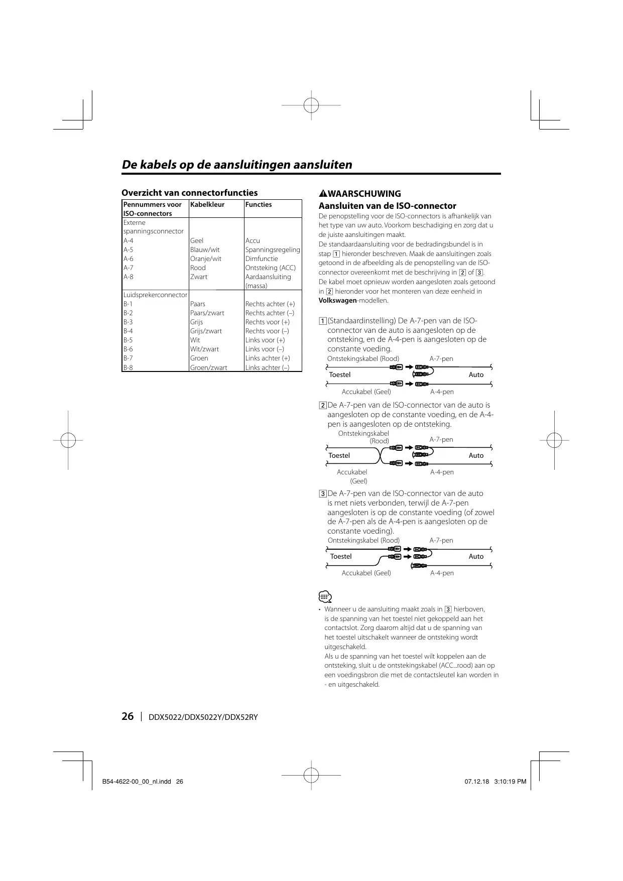 De kabels op de aansluitingen aansluiten Overzicht van connectorfuncties Pennummers voor ISO-connectors Externe spanningsconnector A-4 A-5 A-6 A-7 A-8 Kabelkleur Functies Geel Blauw/wit Oranje/wit Rood Zwart Accu Spanningsregeling Dimfunctie Ontsteking (ACC) Aardaansluiting (massa) Luidsprekerconnector B-1 B-2 B-3 B-4 B-5 B-6 B-7 B-8 Paars Paars/zwart Grijs Grijs/zwart Wit Wit/zwart Groen Groen/zwart Rechts achter (+) Rechts achter (–) Rechts voor (+) Rechts voor (–) Links voor (+) Links voor (–) Links achter (+) Links achter (–) 2WAARSCHUWING Aansluiten van de ISO-connector De penopstelling voor de ISO-connectors is afhankelijk van het type van uw auto. Voorkom beschadiging en zorg dat u de juiste aansluitingen maakt. De standaardaansluiting voor de bedradingsbundel is in stap 1 hieronder beschreven. Maak de aansluitingen zoals getoond in de afbeelding als de penopstelling van de ISOconnector overeenkomt met de beschrijving in 2 of 3. De kabel moet opnieuw worden aangesloten zoals getoond in 2 hieronder voor het monteren van deze eenheid in Volkswagen-modellen. 1 (Standaardinstelling) De A-7-pen van de ISOconnector van de auto is aangesloten op de ontsteking, en de A-4-pen is aangesloten op de constante voeding. Ontstekingskabel (Rood) A-7-pen Toestel Accukabel (Geel) Auto A-4-pen 2 De A-7-pen van de ISO-connector van de auto is aangesloten op de constante voeding, en de A-4pen is aangesloten op de ontsteking. Ontstekingskabel (Rood) A-7-pen Toestel Accukabel (Geel) Auto A-4-pen 3 De A-7-pen van de ISO-connector van de auto is met niets verbonden, terwijl de A-7-pen aangesloten is op de constante voeding (of zowel de A-7-pen als de A-4-pen is aangesloten op de constante voeding). Ontstekingskabel (Rood) A-7-pen Toestel Accukabel (Geel) Auto A-4-pen