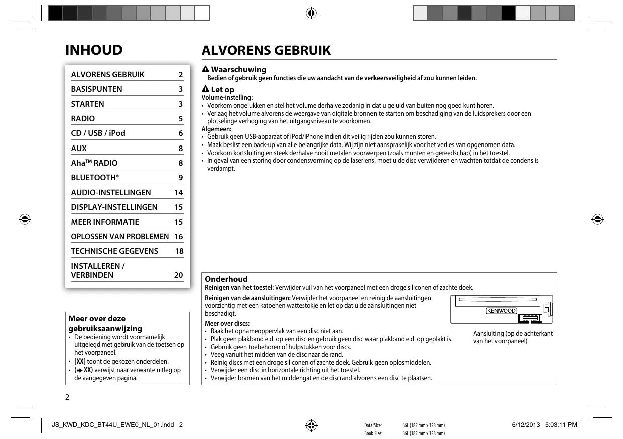 - Wanneer het volume wordt aangepast tijdens het ontvangen van verkeersinformatie, een noodbericht of nieuwsuitzending, wordt het aangepaste volume automatisch opgeslagen. Dit volume wordt ingesteld wanneer later weer verkeersinformatie, een noodbericht of nieuwsuitzending wordt ontvangen. NEDERLANDS | JS_KWD_KDC_BT44U_EWE0_NL_01.indd 5 Data Size: Book Size: B6L (182 mm x 128 mm) B6L (182 mm x 128 mm)