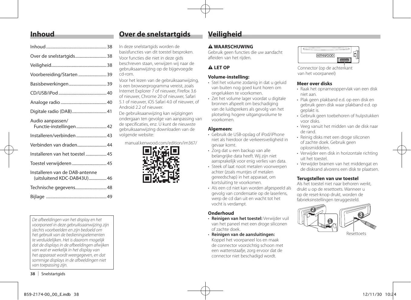 Over de snelstartgids 38 Veiligheid 38 Voorbereiding/Starten 39 Basisbewerkingen 39 CD/USB/iPod 40 Analoge radio 40 Digitale radio (DAB) 41 Audio aanpassen/ Functie-instellingen 42