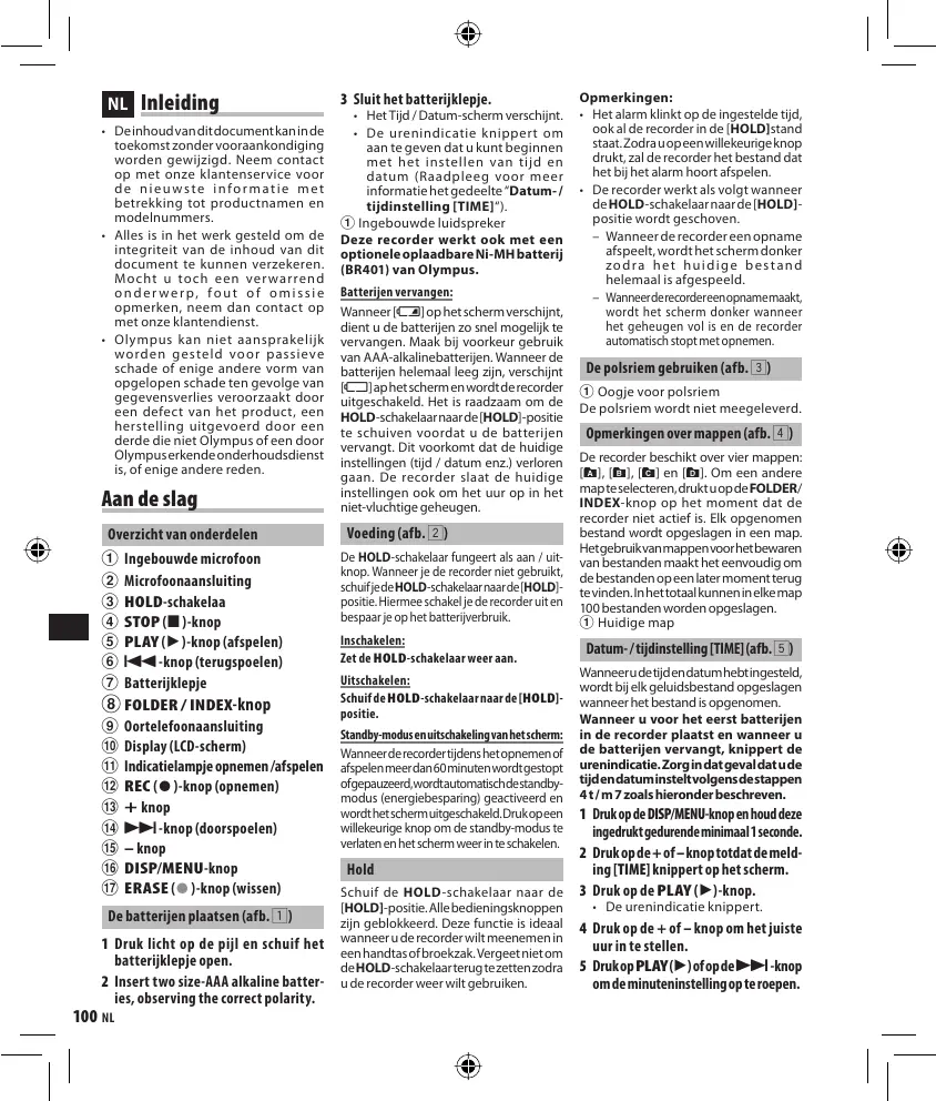 - De urenindicatie knippert om aan te geven dat u kunt beginnen met het instellen van tijd en datum (Raadpleeg voor meer informatie het gedeelte “Datum- / tijdinstelling [TIME]“). 1 Ingebouwde luidspreker Deze recorder werkt ook met een optionele oplaadbare Ni-MH batterij (BR401) van Olympus. Batterijen vervangen: Wanneer [N] op het scherm verschijnt, dient u de batterijen zo snel mogelijk te vervangen. Maak bij voorkeur gebruik van AAA-alkalinebatterijen. Wanneer de batterijen helemaal leeg zijn, verschijnt [O] ap het scherm en wordt de recorder uitgeschakeld. Het is raadzaam om de HOLD-schakelaar naar de [HOLD]-positie te schuiven voordat u de batterijen vervangt. Dit voorkomt dat de huidige instellingen (tijd / datum enz.) verloren gaan. De recorder slaat de huidige instellingen ook om het uur op in het niet-vluchtige geheugen. Voeding (afb. 2) De HOLD-schakelaar fungeert als aan / uitknop. Wanneer je de recorder niet gebruikt, schuif je de HOLD-schakelaar naar de [HOLD]positie. Hiermee schakel je de recorder uit en bespaar je op het batterijverbruik. Inschakelen: Zet de HOLD-schakelaar weer aan. Uitschakelen: Schuif de HOLD-schakelaar naar de [HOLD]positie. Standby-modus en uitschakeling van het scherm: Wanneer de recorder tijdens het opnemen of afspelen meer dan 60 minuten wordt gestopt ofgepauzeerd,wordtautomatischdestandbymodus (energiebesparing) geactiveerd en wordt het scherm uitgeschakeld. Druk op een willekeurige knop om de standby-modus te verlaten en het scherm weer in te schakelen. Hold Schuif de HOLD-schakelaar naar de [HOLD]-positie. Alle bedieningsknoppen zijn geblokkeerd. Deze functie is ideaal wanneer u de recorder wilt meenemen in een handtas of broekzak. Vergeet niet om de HOLD-schakelaar terug te zetten zodra u de recorder weer wilt gebruiken. Opmerkingen: