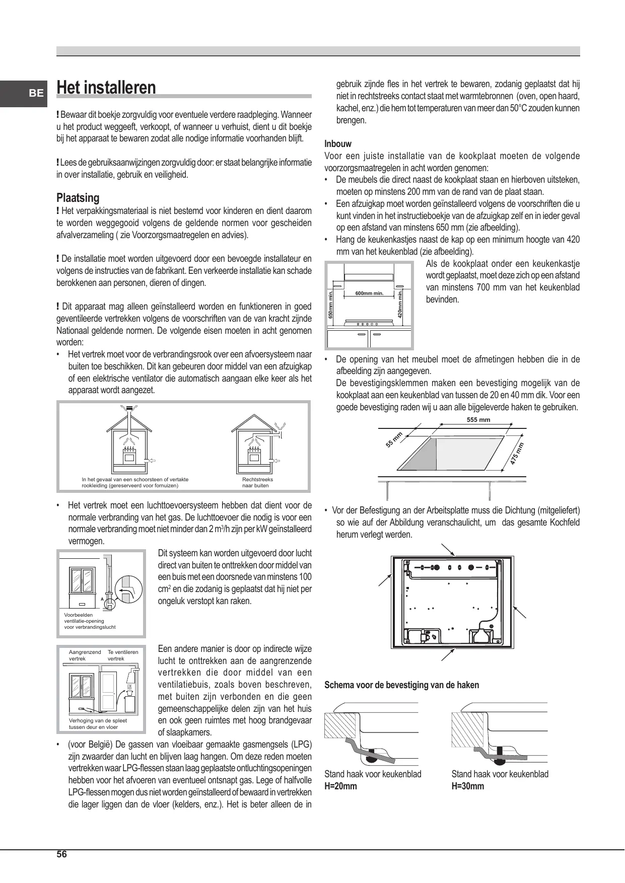 - Het vertrek moet voor de verbrandingsrook over een afvoersysteem naar buiten toe beschikken. Dit kan gebeuren door middel van een afzuigkap of een elektrische ventilator die automatisch aangaan elke keer als het apparaat wordt aangezet. Inbouw Voor een juiste installatie van de kookplaat moeten de volgende voorzorgsmaatregelen in acht worden genomen: