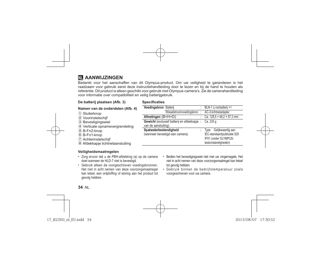 - Tehniskā palīdzība klientiem Eiropā Lūdzu, apmeklējiet mūsu mājas lapu http://www.olympus-europa.com vai zvaniet uz tālruņa numuru: 00800 - 67 10 83 00 (bezmaksas) +49 180 5 - 67 10 83 vai +49 40 - 237 73 4899 (maksas) Pircējiem Eiropā Šis simbols [pārsvītrota atkritumu tvertne uz riteņiem, WEEE IV pielikums] nozīmē atsevišķu elektriskā un elektroniskā aprīkojuma atkritumu savākšanu ES valstīs. Lūdzam neizsviest šādu aprīkojumu mājsaimniecības atkritumu tvertnēs. Ja šis izstrādājums ir jāizsviež, lūdzam izmantot savā valstī pieejamās atkritumu apsaimniekošanas un savākšanas sistēmas. LV 33 16̲R2260̲lv̲EU.indd 33 2013/08/07 17:28:13 NL AANWIJZINGEN Bedankt voor het aanschaffen van dit Olympus-product. Om uw veiligheid te garanderen is het raadzaam voor gebruik eerst deze instructiehandleiding door te lezen en bij de hand te houden als referentie. Dit product is alleen geschikt voor gebruik met Olympus-camera’s. Zie de camerahandleiding voor informatie over compatibiliteit en veilig batterijgebruik. De batterij plaatsen (Afb. 3) Namen van de onderdelen (Afb. 4) 1 Sluiterknop 2 Voorinstelschijf 3 Bevestigingswiel 4 Verticale opnamevergrendeling 5 B-Fn2-knop 6 B-Fn1-knop 7 Achterinstelschijf 8 Afdekkapje lichtnetaansluiting Specificaties Voedingsbron Batterij Wisselstroomvoedingsbron Afmetingen (B×H×D) Gewicht (exclusief batterij en afdekkapje van de aansluiting) Spatwaterbestendigheid (wanneer bevestigd aan camera) Veiligheidsmaatregelen