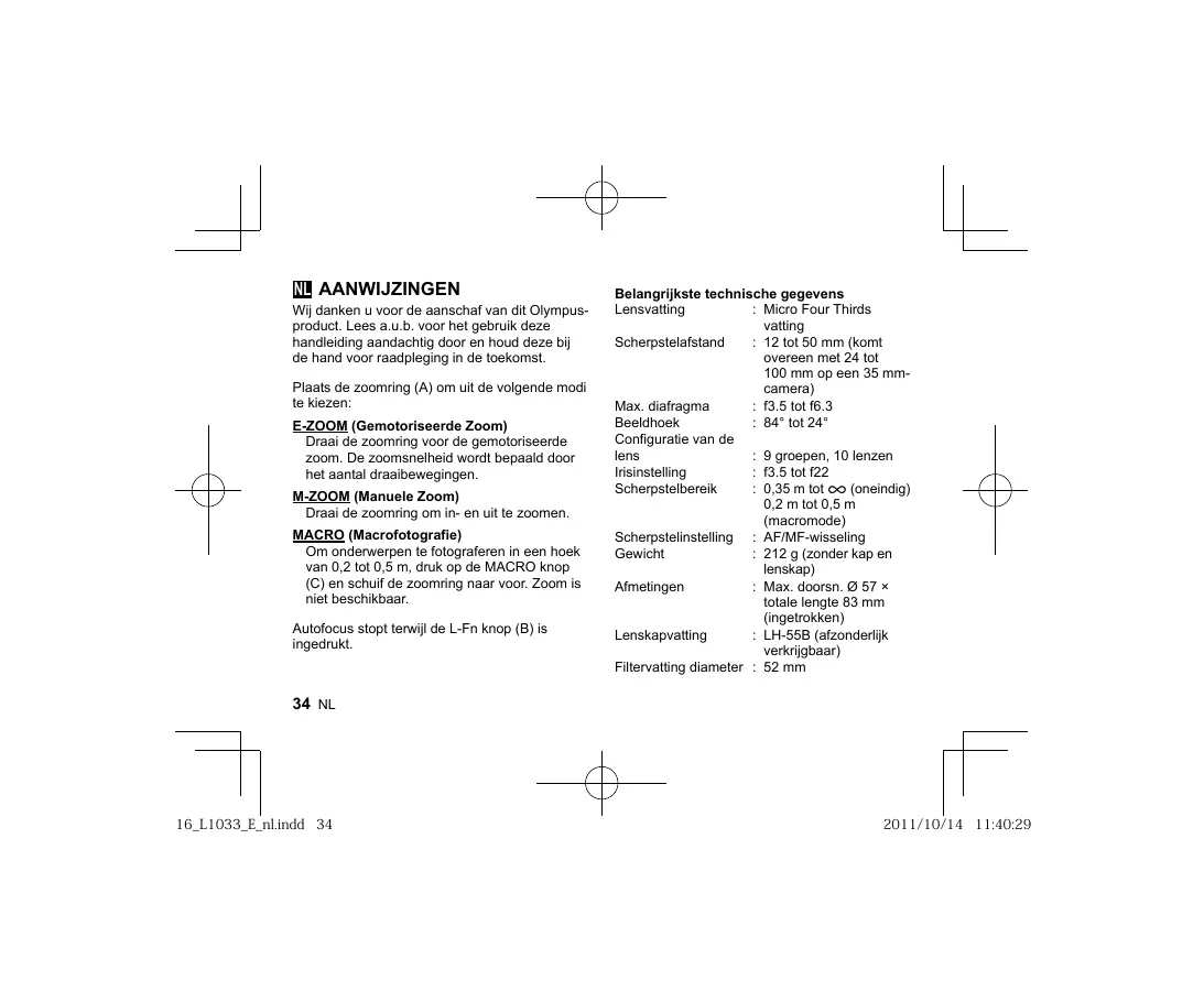NL AANWIJZINGEN Wij danken u voor de aanschaf van dit Olympusproduct. Lees a.u.b. voor het gebruik deze handleiding aandachtig door en houd deze bij de hand voor raadpleging in de toekomst. Plaats de zoomring (A) om uit de volgende modi te kiezen: E-ZOOM (Gemotoriseerde Zoom) Draai de zoomring voor de gemotoriseerde zoom. De zoomsnelheid wordt bepaald door het aantal draaibewegingen. M-ZOOM (Manuele Zoom) Draai de zoomring om in- en uit te zoomen. MACRO (Macrofotografie) Om onderwerpen te fotograferen in een hoek van 0,2 tot 0,5 m, druk op de MACRO knop (C) en schuif de zoomring naar voor. Zoom is niet beschikbaar. Autofocus stopt terwijl de L-Fn knop (B) is ingedrukt.