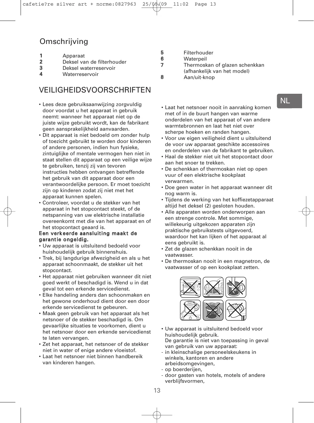 • Laat het netsnoer nooit in aanraking komen met of in de buurt hangen van warme onderdelen van het apparaat of van andere warmtebronnen en laat het niet over scherpe hoeken en randen hangen. • Voor uw eigen veiligheid dient u uitsluitend de voor uw apparaat geschikte accessoires en onderdelen van de fabrikant te gebruiken. • Haal de stekker niet uit het stopcontact door aan het snoer te trekken. • De schenkkan of thermoskan niet op open vuur of een elektrische kookplaat verwarmen. • Doe geen water in het apparaat wanneer dit nog warm is. • Tijdens de werking van het koffiezetapparaat altijd het deksel (2) gesloten houden. • Alle apparaten worden onderworpen aan een strenge controle. Met sommige, willekeurig uitgekozen apparaten zijn praktische gebruikstests uitgevoerd, waardoor het kan lijken of het apparaat al eens gebruikt is. • Zet de glazen schenkkan nooit in de vaatwasser. • De thermoskan nooit in een magnetron, de vaatwasser of op een kookplaat zetten.