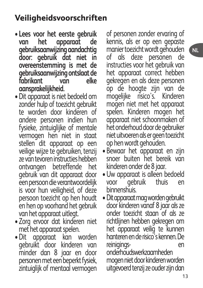 Veiligheidsvoorschriften eLees voor het eerste gebruik van het apparaat de rutsaanudain aandachtig oor: gebruik dat niet in overeenstemming is met de gebrutsaanuijang ontslaat de brikant van elke aansprakelikheid. + Dit apparaat is niet bedoeld om zonder hulp of toezicht gebruikt te worden door kinderen of andere personen indien hun fysieke, zintuiglijke of mentale vermogen hen niet in staat stellen dit apparaat op een veilige wijze te gebruiken, tenzÿ ze van tevoren instructies hebben ontvangen betreffende het gebruik van dit apparaat door een persoon die verantwoordelik is voor hun veiligheid, of deze persoon toezicht op hen houdt en hen op voorhand het gebruik van het apparaat uitlegt. +Zorg ervoor dat kinderen niet met het apparaat spelen. Dit apparaat kan worden gebruikt door kinderen van minder dan 8 jaar en door personen met een pepe fysiek, zintuiglijk of mentaal vermogen of personen zonder ervaring of kennis, als er op een gepaste manier toezicht wordt gehouden of als deze personen de instructies voor het gebruik van het apparaat correct hebben gekregen en als deze personen op de hoogte zijn van de mogelike risico's. Kinderen mogen niet met het apparaat spelen. Kinderen mogen het apparaat niet schoonmaken of het onderhoud door de gebruiker niet uitvoeren als er geen toezicht op hen wordt gehouden. + Bewaar het pparqat en zijn snoer buiten het bereik van kinderen onder de 8 jaar. + Uw apparaat is alleen bedoeld voor gebruik thuis en binnenshuis. « Dit apparaat mag worden gebruikt door kinderen vanaf 8 jaar als ze onder toezicht staan of als ze richtlinen hebben gedegen om het apparaat veilig te kunnen hanteren en derisico skennen. De reinigings- en onderhoudswerkzaamheden mogen niet door kinderen worden uitgevoerd tenzi) ze ouder zijn dan LE]