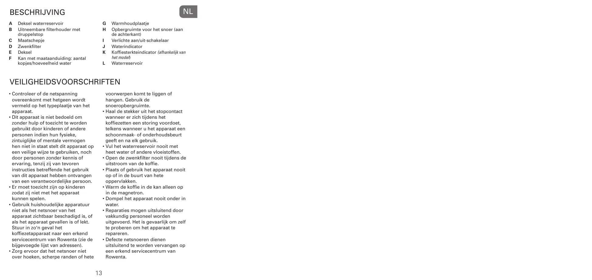 • Ne pas poser ou utiliser l'appareil sur ou à proximité de surfaces chaudes. • Rechauffer le café dans la verseuse uniquement dans un four à micro-ondes. • Ne pas immerger l'appareil. • Ne confier les réparations d'appareils électroménagers qu'à des spécialistes. Réparer un appareil soi-même peut constituer un danger pour l'utilisateur. • Un cordon défectueux doit exclusivement être changé par un Centre Service agréé Rowenta pour éviter tout risque. • Pour d'éventuelles détériorations de l'appareil dues à une utilisation inappropriée ou non conforme au mode d'emploi, aucune responsabilité ne peut engager Rowenta. • À la fin de la durée de vie de l'appareil, il y a lieu de l'évacuer de façon appropriée.