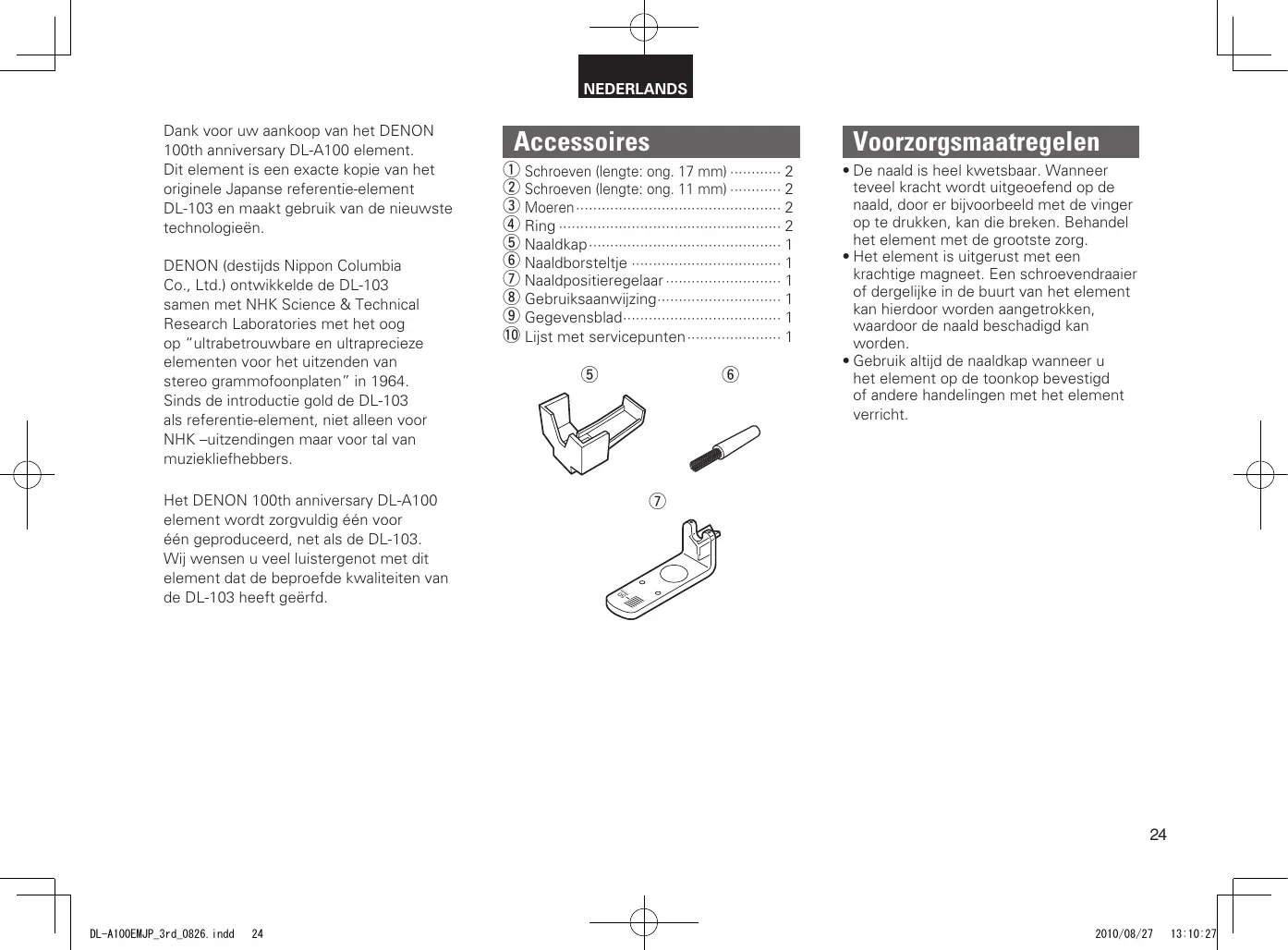 Dank voor uw aankoop van het DENON 100th anniversary DL-A100 element. Dit element is een exacte kopie van het originele Japanse referentie-element DL-103 en maakt gebruik van de nieuwste technologieën.
