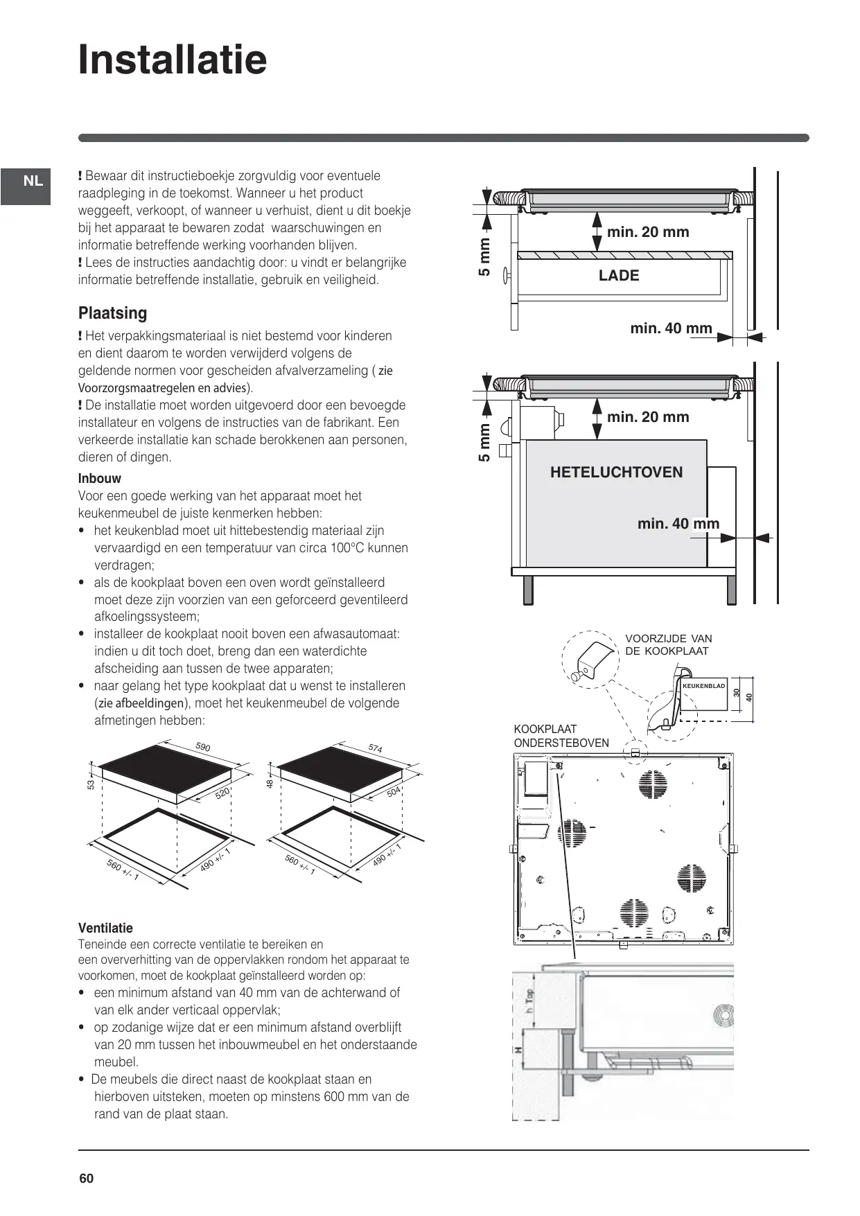 Painel de comandos Starten en gebruik). 10Controlelampjes GEPROGRAMMEERD KOOKGEDEELTE*: tonen de kookgedeeltes aan als u een programmering start (zie Starten en gebruik). 11Toets BLOKKERING BEDIENINGSPANEEL om te voorkomen dat er ongewilde wijzigingen aan de regeling van het kookvlak worden uitgevoerd (zie Starten en gebruik). 12Controlelampje BLOKKERING BEDIENINGSPANEEL: toont dat de blokkering van het bedieningspaneel heeft plaatsgevonden (zie Starten en gebruik). 13 BOOSTER* toets om het extra vermogen van de kookzone in te schakelen (zie Starten en gebruik). 14 • à au moins 40 mm de distance du mur arrière ou de toute autre surface verticale; • de manière à ce qu’il reste au moins 20 mm de distance entre la découpe d’encastrement et le meuble en dessous. • Les meubles jouxtant la table, dont la hauteur dépasse celle du plan de cuisson, doivent être placés à au moins 600 mm du bord du plan.