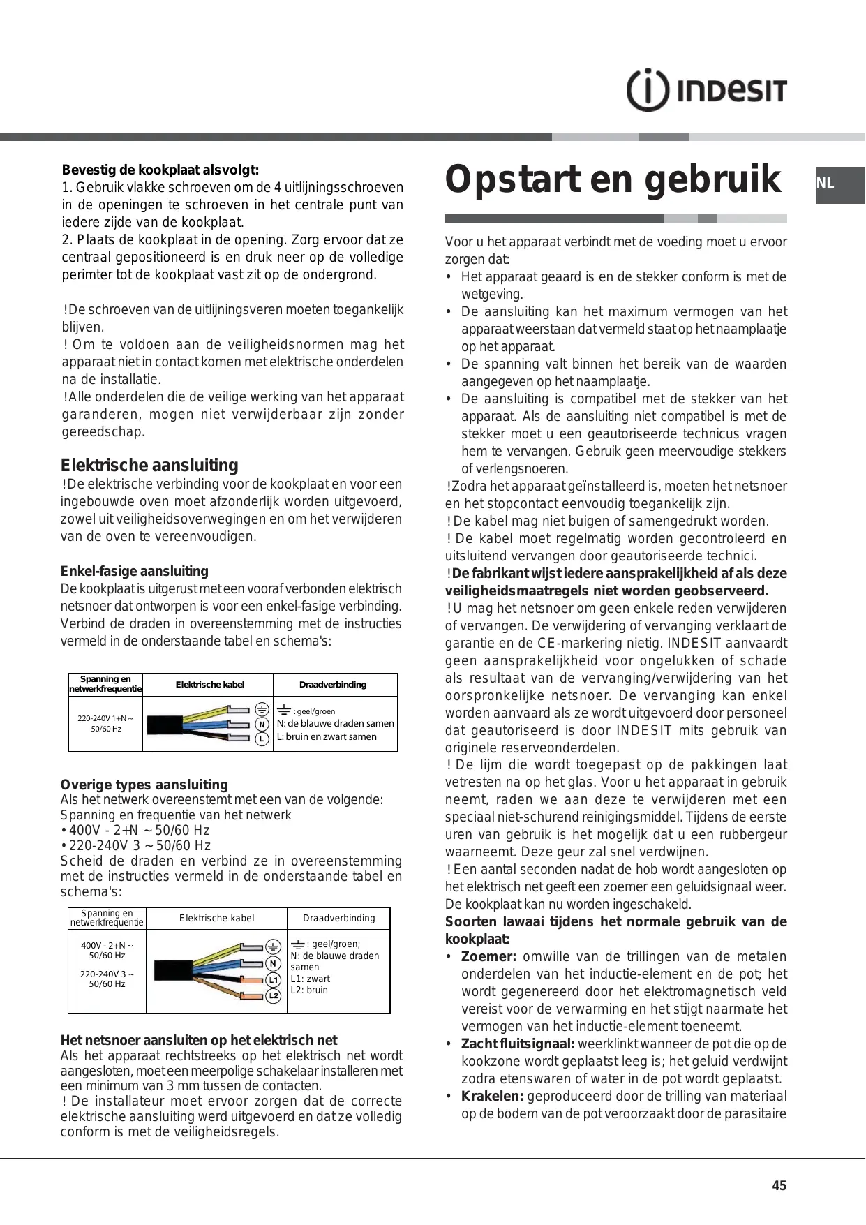 - De aansluiting is compatibel met de stekker van het apparaat. Als de aansluiting niet compatibel is met de stekker moet u een geautoriseerde technicus vragen hem te vervangen. Gebruik geen meervoudige stekkers of verlengsnoeren. ! Zodra het apparaat geïnstalleerd is, moeten het netsnoer en het stopcontact eenvoudig toegankelijk zijn. ! De kabel mag niet buigen of samengedrukt worden. ! De kabel moet regelmatig worden gecontroleerd en uitsluitend vervangen door geautoriseerde technici. ! De fabrikant wijst iedere aansprakelijkheid af als deze veiligheidsmaatregels niet worden geobserveerd. ! U mag het netsnoer om geen enkele reden verwijderen of vervangen. De verwijdering of vervanging verklaart de garantie en de CE-markering nietig. INDESIT aanvaardt geen aansprakelijkheid voor ongelukken of schade als resultaat van de vervanging/verwijdering van het oorspronkelijke netsnoer. De vervanging kan enkel worden aanvaard als ze wordt uitgevoerd door personeel dat geautoriseerd is door INDESIT mits gebruik van originele reserveonderdelen. ! De lijm die wordt toegepast op de pakkingen laat vetresten na op het glas. Voor u het apparaat in gebruik neemt, raden we aan deze te verwijderen met een speciaal niet-schurend reinigingsmiddel. Tijdens de eerste uren van gebruik is het mogelijk dat u een rubbergeur waarneemt. Deze geur zal snel verdwijnen. ! Een aantal seconden nadat de hob wordt aangesloten op het elektrisch net geeft een zoemer een geluidsignaal weer. De kookplaat kan nu worden ingeschakeld. Soorten lawaai tijdens het normale gebruik van de kookplaat: