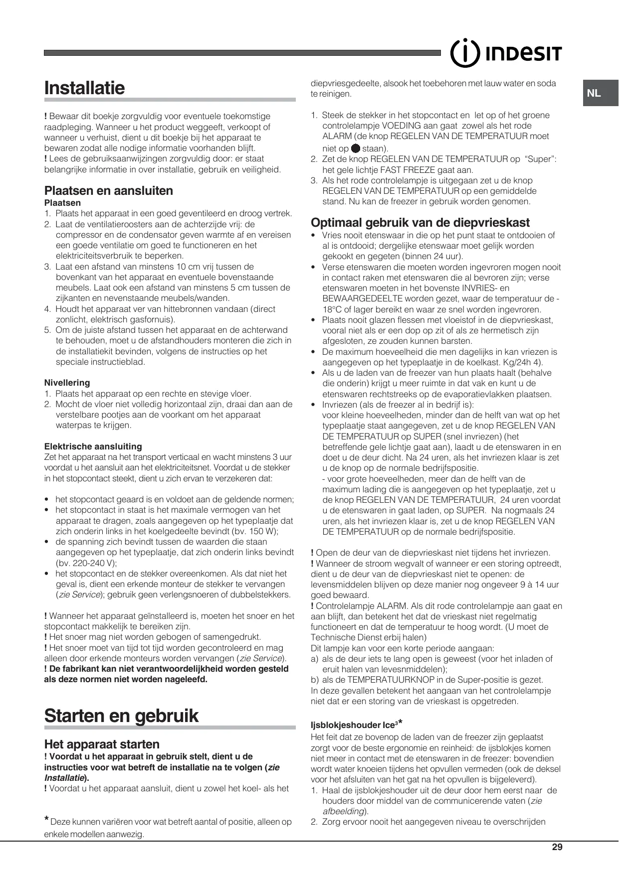 FONCTIONNEMENT CONGELATEUR (voir Description). • Ne recongelez pas des aliments décongelés ou en cours de décongélation; il faut les faire cuire et les consommer (dans les 24 heures). • Les aliments frais à congeler ne doivent pas être placés au contact d’aliments déjà congelés; il faut les stocker dans le compartiment supérieur CONGELATION et CONSERVATION où la température qui descend au-dessous de -18°C garantit une vitesse de congélation adéquate. • Ne stockez pas dans votre congélateur des bouteilles en verre contenant des liquides, bouchées ou fermées hermétiquement, elles pourraient se briser. • L’étiquette placée à l’intérieur du congélateur vous renseigne sur la quantité maximale d’aliments pouvant être congelée quotidiennement (par exemple: 4 kg/24h). • Pour gagner de la place à l’intérieur du congélateur, vous pouvez enlever les tiroirs (sauf le tiroir du bas) et stocker vos aliments directement sur les plaques évaporantes. • Pour congeler (si le congélateur est déjà en service) : - de petites quantités, inférieures à la moitié de la quantité reportée sur l’étiquette, amenez le bouton de REGLAGE DE LA TEMPERATURE sur SUPER (congélation rapide) (allumage du voyant jaune correspondant), introduisez les aliments et fermez la porte. Au bout de 24 heures, quand la congélation est terminée, ramenez le bouton de REGLAGE DE LA TEMPERATURE sur la position de fonctionnement normal. - de grosses quantités, supérieures à la moitié de la charge maximale indiquée sur l’étiquette, amenez le bouton REGLAGE DE LA TEMPERATURE sur SUPER, 24 heures avant d’introduire des aliments à congeler. Au bout de 24 heures, quand la congélation est terminée, ramenez le bouton de REGLAGE DE LA TEMPERATURE sur la position de fonctionnement normal. ! Evitez d’ouvrir la porte pendant la phase de congélation. ! En cas de coupure de courant ou de panne, n’ouvrez pas la porte du congélateur : les produits surgelés et congelés se conserveront ainsi sans problème pendant 9 - 14 heures environ. ! Voyant ALARM. L’allumage prolongé du voyant rouge indique que le congélateur ne fonctionne pas bien et qu’à l’intérieur la température monte trop. (Appelez le Service Après-Vente.). Il arrive que ce voyant s’allume pendant un bref laps de temps: a) quand la porte reste ouverte trop longtemps (lors du stockage des denrées ou de leur prélèvement). b) quand le bouton RÉGLAGE DE LA TEMPÉRATURE a été placé sur la position “Super”. Dans ces deux cas, l’allumage du voyant n’indique aucun défaut ou anomalie de fonctionnement du congélateur. Bac à glaçons Ice3.* Placés dans la partie supérieure des tiroirs du compartiment freezer, ils sont plus ergonomiques et garantissent davantage de propreté: en effet, les glaçons ne touchent plus aux aliments stockés dans le freezer; de plus, fini l'eau qui dégouline lorsque vous rangez votre bac (un couvercle est fourni pour boucher le récipient après l'avoir rempli).