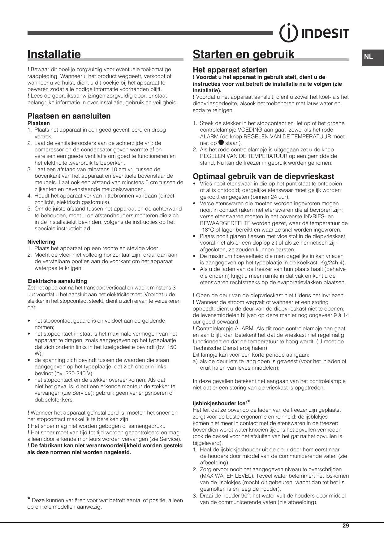 Plaatsen 1. Plaats het apparaat in een goed geventileerd en droog vertrek. 2. Laat de ventilatieroosters aan de achterzijde vrij: de compressor en de condensator geven warmte af en vereisen een goede ventilatie om goed te functioneren en het elektriciteitsverbruik te beperken. 3. Laat een afstand van minstens 10 cm vrij tussen de bovenkant van het apparaat en eventuele bovenstaande meubels. Laat ook een afstand van minstens 5 cm tussen de zijkanten en nevenstaande meubels/wanden. 4. Houdt het apparaat ver van hittebronnen vandaan (direct zonlicht, elektrisch gasfornuis). 5. Om de juiste afstand tussen het apparaat en de achterwand te behouden, moet u de afstandhouders monteren die zich in de installatiekit bevinden, volgens de instructies op het speciale instructieblad. Nivellering 1. Plaats het apparaat op een rechte en stevige vloer. 2. Mocht de vloer niet volledig horizontaal zijn, draai dan aan de verstelbare pootjes aan de voorkant om het apparaat waterpas te krijgen. Elektrische aansluiting Zet het apparaat na het transport verticaal en wacht minstens 3 uur voordat u het aansluit aan het elektriciteitsnet. Voordat u de stekker in het stopcontact steekt, dient u zich ervan te verzekeren dat: • het stopcontact geaard is en voldoet aan de geldende normen; • het stopcontact in staat is het maximale vermogen van het apparaat te dragen, zoals aangegeven op het typeplaatje dat zich onderin links in het koelgedeelte bevindt (bv. 150 W); • de spanning zich bevindt tussen de waarden die staan aangegeven op het typeplaatje, dat zich onderin links bevindt (bv. 220-240 V); • het stopcontact en de stekker overeenkomen. Als dat niet het geval is, dient een erkende monteur de stekker te vervangen (zie Service); gebruik geen verlengsnoeren of dubbelstekkers. ! Wanneer het apparaat geïnstalleerd is, moeten het snoer en het stopcontact makkelijk te bereiken zijn. ! Het snoer mag niet worden gebogen of samengedrukt. ! Het snoer moet van tijd tot tijd worden gecontroleerd en mag alleen door erkende monteurs worden vervangen (zie Service). ! De fabrikant kan niet verantwoordelijkheid worden gesteld als deze normen niet worden nageleefd.