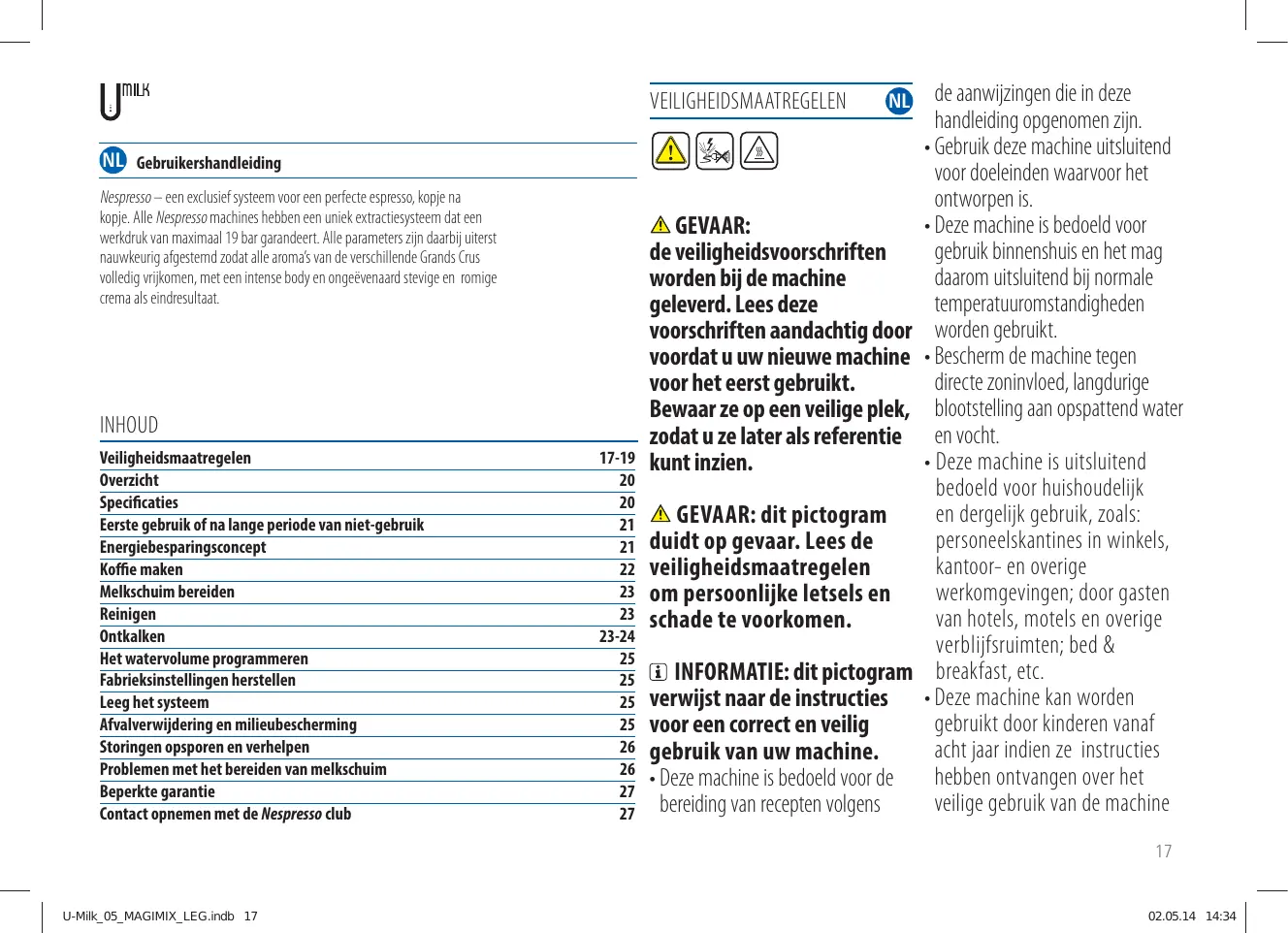 NL Gebruikershandleiding Nespresso – een exclusief systeem voor een perfecte espresso, kopje na kopje. Alle Nespresso machines hebben een uniek extractiesysteem dat een werkdruk van maximaal 19 bar garandeert. Alle parameters zijn daarbij uiterst nauwkeurig afgestemd zodat alle aroma’s van de verschillende Grands Crus volledig vrijkomen, met een intense body en ongeëvenaard stevige en romige crema als eindresultaat. INHOUD Veiligheidsmaatregelen Overzicht Specificaties Eerste gebruik of na lange periode van niet-gebruik Energiebesparingsconcept Koffie maken Melkschuim bereiden Reinigen Ontkalken Het watervolume programmeren Fabrieksinstellingen herstellen Leeg het systeem Afvalverwijdering en milieubescherming Storingen opsporen en verhelpen Problemen met het bereiden van melkschuim Beperkte garantie Contact opnemen met de Nespresso club 17-19