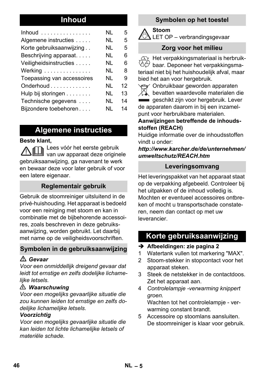 Algemene instructies Beste klant, Lees vóór het eerste gebruik van uw apparaat deze originele gebruiksaanwijzing, ga navenant te werk en bewaar deze voor later gebruik of voor een latere eigenaar. Reglementair gebruik Gebruik de stoomreiniger uitsluitend in de privé-huishouding. Het apparaat is bedoeld voor een reiniging met stoom en kan in combinatie met de bijbehorende accessoires, zoals beschreven in deze gebruiksaanwijzing, worden gebruikt. Let daarbij met name op de veiligheidsvoorschriften. Symbolen in de gebruiksaanwijzing Gevaar Voor een onmiddellijk dreigend gevaar dat leidt tot ernstige en zelfs dodelijke lichamelijke letsels. 몇 Waarschuwing Voor een mogelijks gevaarlijke situatie die zou kunnen leiden tot ernstige en zelfs dodelijke lichamelijke letsels. Voorzichtig Voor een mogelijks gevaarlijke situatie die kan leiden tot lichte lichamelijke letsels of materiële schade.