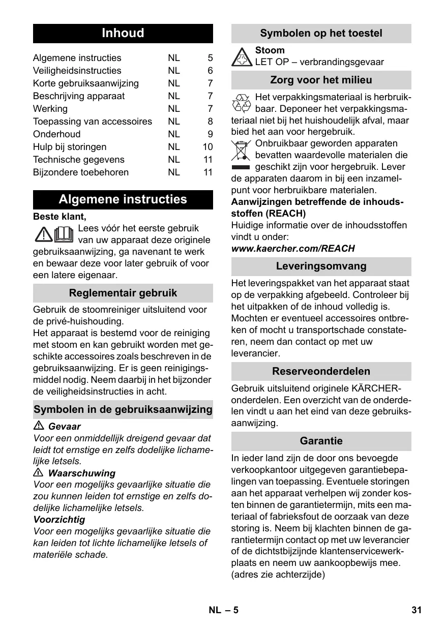 Algemene instructies Beste klant, Lees vóór het eerste gebruik van uw apparaat deze originele gebruiksaanwijzing, ga navenant te werk en bewaar deze voor later gebruik of voor een latere eigenaar. Reglementair gebruik Gebruik de stoomreiniger uitsluitend voor de privé-huishouding. Het apparaat is bestemd voor de reiniging met stoom en kan gebruikt worden met geschikte accessoires zoals beschreven in de gebruiksaanwijzing. Er is geen reinigingsmiddel nodig. Neem daarbij in het bijzonder de veiligheidsinstructies in acht. Symbolen in de gebruiksaanwijzing Gevaar Voor een onmiddellijk dreigend gevaar dat leidt tot ernstige en zelfs dodelijke lichamelijke letsels. 몇 Waarschuwing Voor een mogelijks gevaarlijke situatie die zou kunnen leiden tot ernstige en zelfs dodelijke lichamelijke letsels. Voorzichtig Voor een mogelijks gevaarlijke situatie die kan leiden tot lichte lichamelijke letsels of materiële schade. Stoom LET OP – verbrandingsgevaar Zorg voor het milieu Het verpakkingsmateriaal is herbruikbaar. Deponeer het verpakkingsmateriaal niet bij het huishoudelijk afval, maar bied het aan voor hergebruik. Onbruikbaar geworden apparaten bevatten waardevolle materialen die geschikt zijn voor hergebruik. Lever de apparaten daarom in bij een inzamelpunt voor herbruikbare materialen. Aanwijzingen betreffende de inhoudsstoffen (REACH) Huidige informatie over de inhoudsstoffen vindt u onder: www.kaercher.com/REACH Leveringsomvang Het leveringspakket van het apparaat staat op de verpakking afgebeeld. Controleer bij het uitpakken of de inhoud volledig is. Mochten er eventueel accessoires ontbreken of mocht u transportschade constateren, neem dan contact op met uw leverancier. Reserveonderdelen Gebruik uitsluitend originele KÄRCHERonderdelen. Een overzicht van de onderdelen vindt u aan het eind van deze gebruiksaanwijzing. Garantie In ieder land zijn de door ons bevoegde verkoopkantoor uitgegeven garantiebepalingen van toepassing. Eventuele storingen aan het apparaat verhelpen wij zonder kosten binnen de garantietermijn, mits een materiaal of fabrieksfout de oorzaak van deze storing is. Neem bij klachten binnen de garantietermijn contact op met uw leverancier of de dichtstbijzijnde klantenservicewerkplaats en neem uw aankoopbewijs mee. (adres zie achterzijde) NL – 5