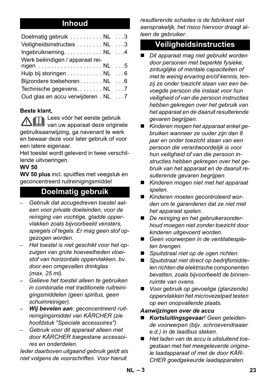 Beste klant, Lees vóór het eerste gebruik van uw apparaat deze originele gebruiksaanwijzing, ga navenant te werk en bewaar deze voor later gebruik of voor een latere eigenaar. Het toestel wordt geleverd in twee verschillende uitvoeringen. WV 50 WV 50 plus incl. spuitfles met veegstuk en geconcentreerd ruitreinigingsmiddel Doelmatig gebruik Gebruik dat accugedreven toestel aaleen voor private doeleinden, voor de reiniging van vochtige, gladde oppervlakken zoals bijvoorbeeld vensters, spiegels of tegels. Er mag geen stof opgezogen worden. – Het toestel is niet geschikt voor het opzuigen van grote hoeveelheden vloeistof van horizontale oppervlakken, bv. door een omgevallen drinkglas (max. 25 ml). – Gelieve het toestel alleen te gebruiken in combinatie met traditionele ruitreinigingsmiddelen (geen spiritus, geen schuimreiniger). – Wij bevelen aan: geconcentreerd ruitreinigingsmiddel van KÄRCHER (zie hoofdstuk "Speciale accessoires") – Gebruik voor dit apparaat alleen met door KÄRCHER toegestane accessoires en onderdelen. Ieder daarboven uitgaand gebruik geldt als niet volgens de voorschriften. Voor hieruit