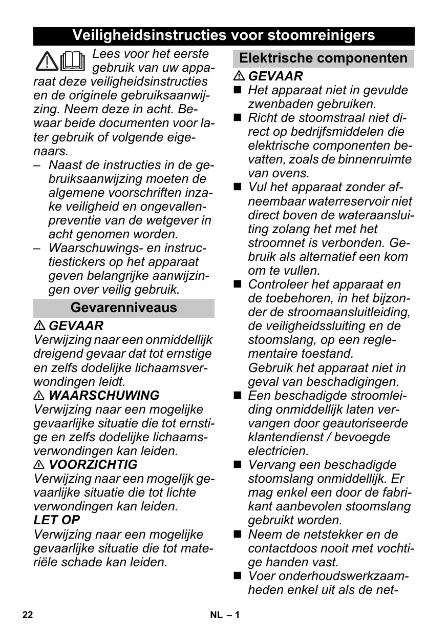Veiligheidsinstructies voor stoomreinigers Lees voor het eerste gebruik van uw apparaat deze veiligheidsinstructies en de originele gebruiksaanwijzing. Neem deze in acht. Bewaar beide documenten voor later gebruik of volgende eigenaars. – Naast de instructies in de gebruiksaanwijzing moeten de algemene voorschriften inzake veiligheid en ongevallenpreventie van de wetgever in acht genomen worden. – Waarschuwings- en instructiestickers op het apparaat geven belangrijke aanwijzingen over veilig gebruik. Gevarenniveaus GEVAAR Verwijzing naar een onmiddellijk dreigend gevaar dat tot ernstige en zelfs dodelijke lichaamsverwondingen leidt. 몇 WAARSCHUWING Verwijzing naar een mogelijke gevaarlijke situatie die tot ernstige en zelfs dodelijke lichaamsverwondingen kan leiden. 몇 VOORZICHTIG Verwijzing naar een mogelijk gevaarlijke situatie die tot lichte verwondingen kan leiden. LET OP Verwijzing naar een mogelijke gevaarlijke situatie die tot materiële schade kan leiden.