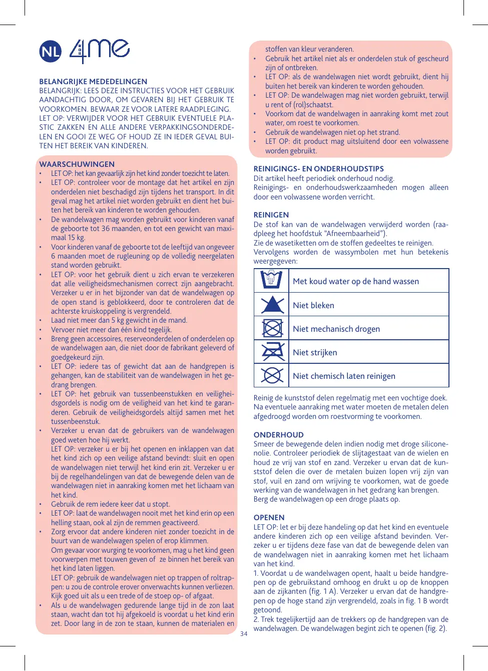 Dit artikel heeft periodiek onderhoud nodig. Reinigings- en onderhoudswerkzaamheden mogen alleen door een volwassene worden verricht. REINIGEN De stof kan van de wandelwagen verwijderd worden (raadpleeg het hoofdstuk “Afneembaarheid”). Zie de wasetiketten om de stoffen gedeeltes te reinigen. Vervolgens worden de wassymbolen met hun betekenis weergegeven: Met koud water op de hand wassen Niet bleken Niet mechanisch drogen Niet strijken Niet chemisch laten reinigen Reinig de kunststof delen regelmatig met een vochtige doek. Na eventuele aanraking met water moeten de metalen delen afgedroogd worden om roestvorming te voorkomen. ONDERHOUD Smeer de bewegende delen indien nodig met droge siliconenolie. Controleer periodiek de slijtagestaat van de wielen en houd ze vrij van stof en zand. Verzeker u ervan dat de kunststof delen die over de metalen buizen lopen vrij zijn van stof, vuil en zand om wrijving te voorkomen, wat de goede werking van de wandelwagen in het gedrang kan brengen. Berg de wandelwagen op een droge plaats op.