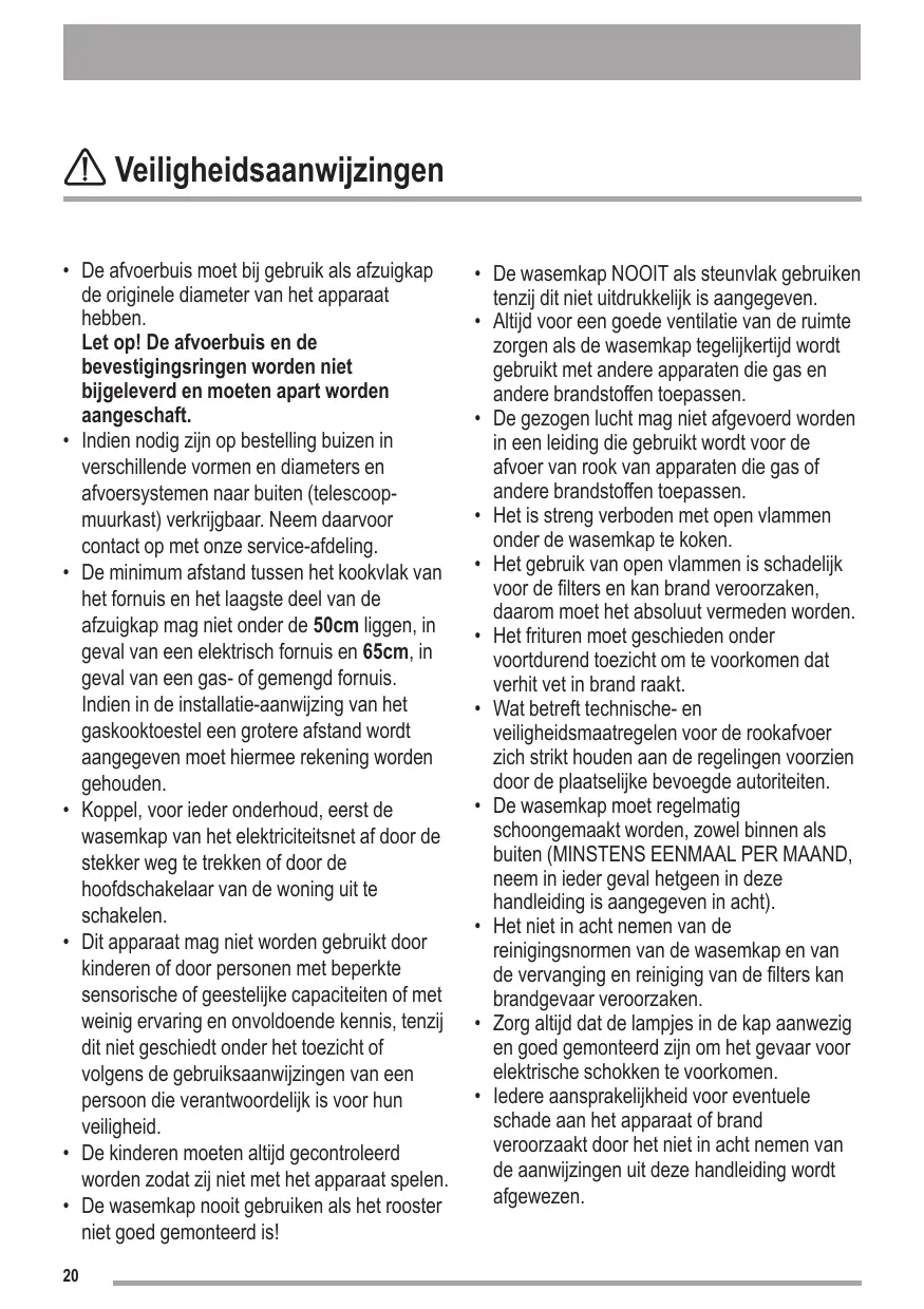 Inhoud Veiligheidsaanwijzingen 20 Algemeen 22 Bediening van de afzuigkap 22 Onderhoud 23 Extra leverbare accessoires 26 Technische gegevens 26 Elektrische aansluiting 27 Installatie 28