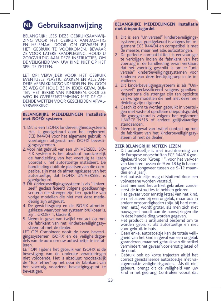NL Gebruiksaanwijzing BELANGRIJKE MEDEDELINGEN Installatie met driepuntsgordel BELANGRIJK: LEES DEZE GEBRUIKSAANWIJZING VOOR HET GEBRUIK AANDACHTIG