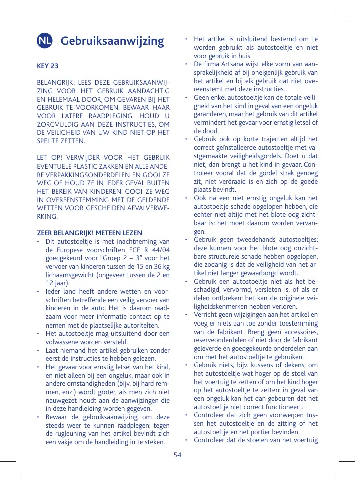 KEY 23 BELANGRIJK: LEES DEZE GEBRUIKSAANWIJZING VOOR HET GEBRUIK AANDACHTIG EN HELEMAAL DOOR, OM GEVAREN BIJ HET GEBRUIK TE VOORKOMEN. BEWAAR HAAR VOOR LATERE RAADPLEGING. HOUD U ZORGVULDIG AAN DEZE INSTRUCTIES, OM DE VEILIGHEID VAN UW KIND NIET OP HET SPEL TE ZETTEN. LET OP! VERWIJDER VOOR HET GEBRUIK EVENTUELE PLASTIC ZAKKEN EN ALLE ANDERE VERPAKKINGSONDERDELEN EN GOOI ZE WEG OF HOUD ZE IN IEDER GEVAL BUITEN HET BEREIK VAN KINDEREN. GOOI ZE WEG IN OVEREENSTEMMING MET DE GELDENDE WETTEN VOOR GESCHEIDEN AFVALVERWERKING. ZEER BELANGRIJK! METEEN LEZEN • Dit autostoeltje is met inachtneming van de Europese voorschriften ECE R 44/04 goedgekeurd voor “Groep 2 – 3” voor het vervoer van kinderen tussen de 15 en 36 kg lichaamsgewicht (ongeveer tussen de 2 en 12 jaar). • Ieder land heeft andere wetten en voorschriften betreffende een veilig vervoer van kinderen in de auto. Het is daarom raadzaam voor meer informatie contact op te nemen met de plaatselijke autoriteiten. • Het autostoeltje mag uitsluitend door een volwassene worden versteld. • Laat niemand het artikel gebruiken zonder eerst de instructies te hebben gelezen. • Het gevaar voor ernstig letsel van het kind, en niet alleen bij een ongeluk, maar ook in andere omstandigheden (bijv. bij hard remmen, enz.) wordt groter, als men zich niet nauwgezet houdt aan de aanwijzingen die in deze handleiding worden gegeven. • Bewaar de gebruiksaanwijzing om deze steeds weer te kunnen raadplegen: tegen de rugleuning van het artikel bevindt zich een vakje om de handleiding in te steken. 54