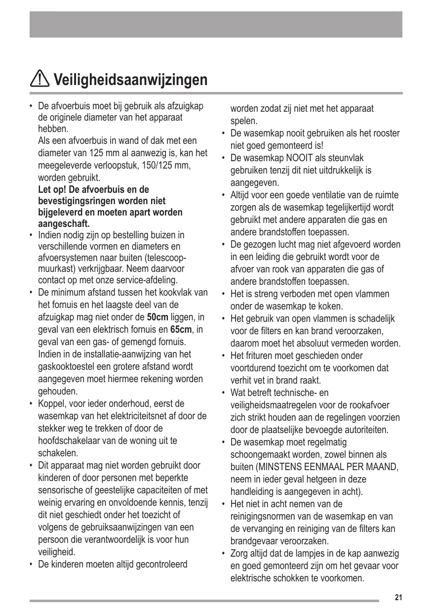 Le bruit de fonctionnement sera un peu plus élevé. Attention ! Le tuyau d’évacuation et les colliers de fixation ne sont pas fournis et doivent être achetés à part.. • La distance minimum entre la superficie de support des récipients sur le dispositif de cuisson et la partie la plus basse de la hotte de cuisine ne doit pas être inférieure à 50cm dans le cas de cuisinières électriques et de 65cm dans le cas de cuisinières à gaz ou mixtes. Si les instructions d’installation du dispositif de cuisson au gaz spécifient une plus grande distance, il faut en tenir compte. • Avant toute opération de nettoyage ou d’entretien, débrancher la hotte du circuit électrique en retirant la prise ou en coupant l’interrupteur général de l’habitation. • L’appareil n’est pas destiné à une utilisation par des enfants ou des personnes à capacités physiques, sensorielles ou mentales réduites et sans expérience et connaissance à moins qu’ils ne soient sous la supervision ou formés sur l’utilisation de l’appareil par une personne responsable de leur sécurité. • Les enfants doivent être surveillés afin qu’ils ne jouent pas avec l’appareil. • Ne jamais utiliser la hotte sans que la grille ne 38
