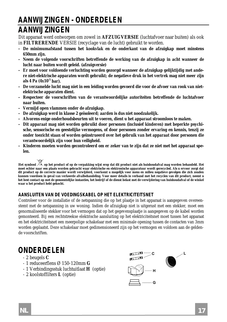 BRANCHEMENT DU CÂBLE ÉLECTRIQUE AU RÉSEAU Avant l’installation, vérifier que la tension du réseau indiquée sur la plaquette se trouvant à l’intérieur de l’appareil correspond à la tension électrique de votre habitation. Si la hotte n’est pas munie de fiche électrique, monter une fiche à norme sur le câble d’alimentation qui soit adaptée à la tension indiquée sur la plaquette des caractéristiques. En cas de branchement électrique direct sur le réseau, il faudra placer un interrupteur omnipolaire entre l’appareil et le réseau ayant une ouverture minimum entre les contacts de 3 mm, et adapté à la tension et répondant aux normes en vigueur.