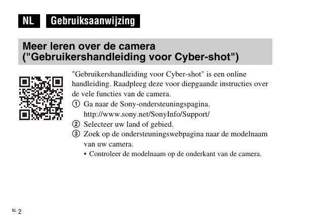 Gebruiksaanwijzing Meer leren over de camera ("Gebruikershandleiding voor Cyber-shot") "Gebruikershandleiding voor Cyber-shot" is een online handleiding. Raadpleeg deze voor diepgaande instructies over de vele functies van de camera. 1 Ga naar de Sony-ondersteuningspagina. http://www.sony.net/SonyInfo/Support/ 2 Selecteer uw land of gebied. 3 Zoek op de ondersteuningswebpagina naar de modelnaam van uw camera.