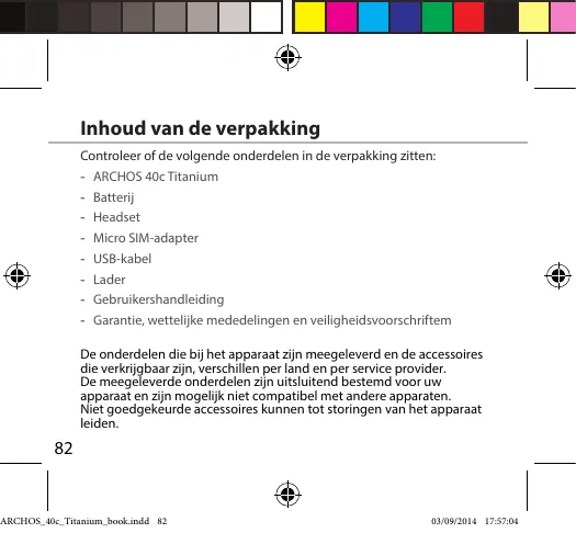 Inhoud van de verpakking Contraleer of de volgende onderdelen in de verpakking ziten: = ARCHOS 40c Titanium