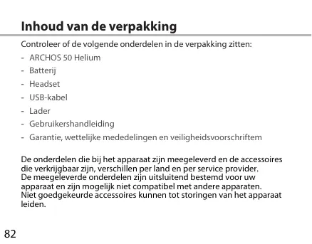 Inhoud van de verpakking Controleer of de volgende onderdelen in de verpakking zittenr = ARCHOS 50 Helium + Batterj + Headset + US8-kabel + Lader + Gebruikershandleiding + Garantie, wettelike mededelingen en veiligheidsvoorschriftem De onderdelen die bj het apparaa zin meegeleverd en de accessoires die verkñjgbaar in, verschilen per land en per service provider. De mecgeleverde onderdelen 2j uitsluienc bestema Poor ur appara en ain mogeljk let compatibel met andere apparaten ex goegekeurde accessoires künnen tot storngen van het apparaat leider