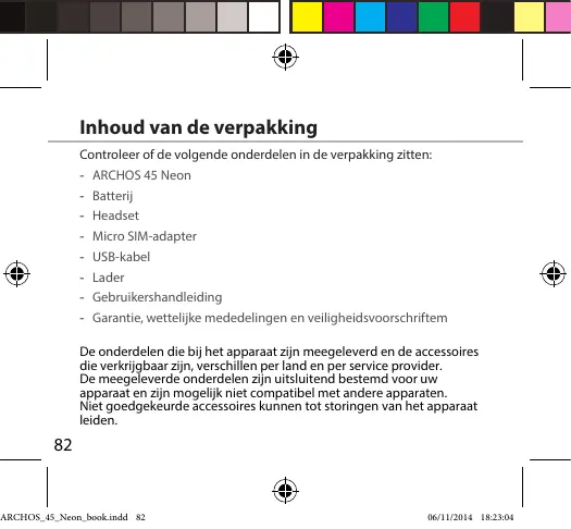06/11/2014 18:23:04 Inhoud van de verpakking Controleer of de volgende onderdelen in de verpakking zitten: -- ARCHOS 45 Neon -- Batterij -- Headset