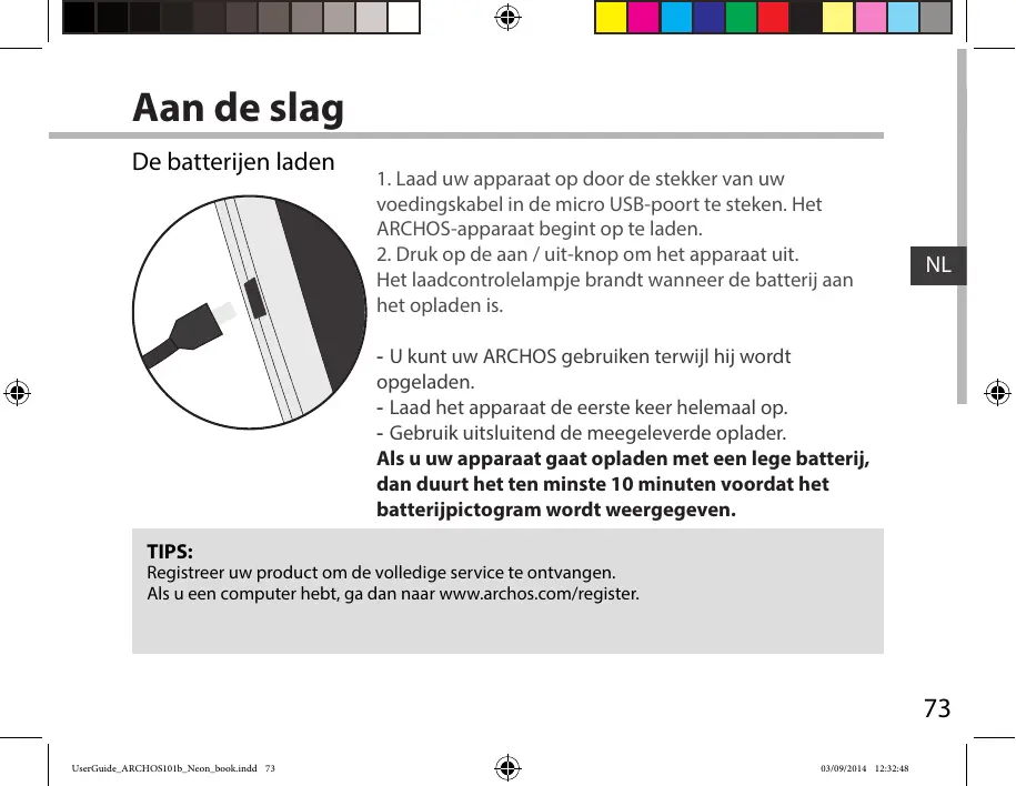 -- U kunt uw ARCHOS gebruiken terwijl hij wordt opgeladen. -- Laad het apparaat de eerste keer helemaal op. -- Gebruik uitsluitend de meegeleverde oplader. Als u uw apparaat gaat opladen met een lege batterij, dan duurt het ten minste 10 minuten voordat het batterijpictogram wordt weergegeven. TIPS: Registreer uw product om de volledige service te ontvangen. Als u een computer hebt, ga dan naar www.archos.com/register.