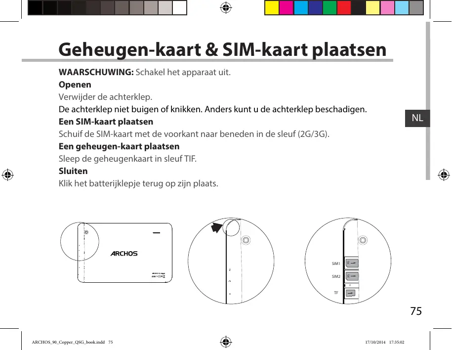 WAARSCHUWING: Schakel het apparaat uit. Openen Verwijder de achterklep. De achterklep niet buigen of knikken. Anders kunt u de achterklep beschadigen. Een SIM-kaart plaatsen Schuif de SIM-kaart met de voorkant naar beneden in de sleuf (2G/3G). Een geheugen-kaart plaatsen Sleep de geheugenkaart in sleuf TIF. Sluiten Klik het batterijklepje terug op zijn plaats.