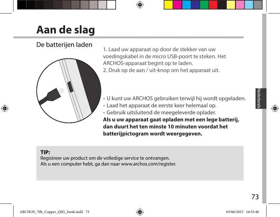 Nederlands -- U kunt uw ARCHOS gebruiken terwijl hij wordt opgeladen. -- Laad het apparaat de eerste keer helemaal op. -- Gebruik uitsluitend de meegeleverde oplader. Als u uw apparaat gaat opladen met een lege batterij, dan duurt het ten minste 10 minuten voordat het batterijpictogram wordt weergegeven. TIP: Registreer uw product om de volledige service te ontvangen. Als u een computer hebt, ga dan naar www.archos.com/register.