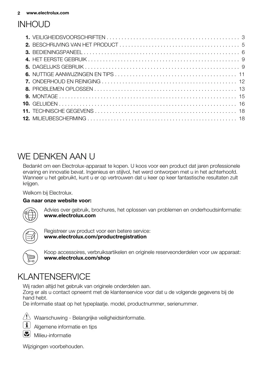 Bedankt om een Electrolux-apparaat te kopen. U koos voor een product dat jaren professionele ervaring en innovatie bevat. Ingenieus en stijlvol, het werd ontworpen met u in het achterhoofd. Wanneer u het gebruikt, kunt u er op vertrouwen dat u keer op keer fantastische resultaten zult krijgen. Welkom bij Electrolux. Ga naar onze website voor: Advies over gebruik, brochures, het oplossen van problemen en onderhoudsinformatie: www.electrolux.com Registreer uw product voor een betere service: www.electrolux.com/productregistration Koop accessoires, verbruiksartikelen en originele reserveonderdelen voor uw apparaat: www.electrolux.com/shop KLANTENSERVICE Wij raden altijd het gebruik van originele onderdelen aan. Zorg er als u contact opneemt met de klantenservice voor dat u de volgende gegevens bij de hand hebt. De informatie staat op het typeplaatje. model, productnummer, serienummer. Waarschuwing - Belangrijke veiligheidsinformatie. Algemene informatie en tips Milieu-informatie Wijzigingen voorbehouden. NEDERLANDS