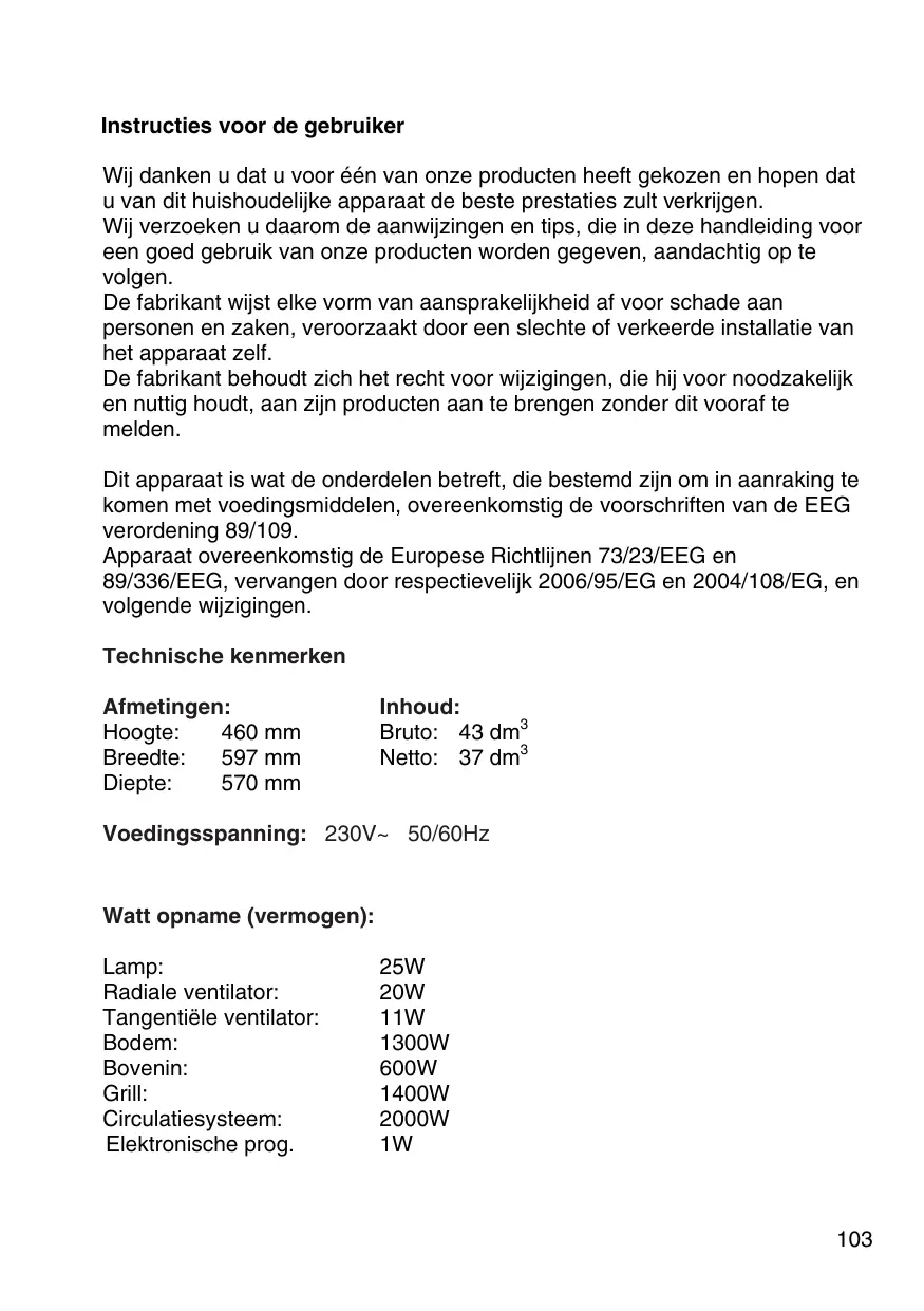 Instructies voor de gebruiker Wij danken u dat u voor één van onze producten heeft gekozen en hopen dat u van dit huishoudelijke apparaat de beste prestaties zult verkrijgen. Wij verzoeken u daarom de aanwijzingen en tips, die in deze handleiding voor een goed gebruik van onze producten worden gegeven, aandachtig op te volgen. De fabrikant wijst elke vorm van aansprakelijkheid af voor schade aan personen en zaken, veroorzaakt door een slechte of verkeerde installatie van het apparaat zelf. De fabrikant behoudt zich het recht voor wijzigingen, die hij voor noodzakelijk en nuttig houdt, aan zijn producten aan te brengen zonder dit vooraf te melden. Dit apparaat is wat de onderdelen betreft, die bestemd zijn om in aanraking te komen met voedingsmiddelen, overeenkomstig de voorschriften van de EEG verordening 89/109. Apparaat overeenkomstig de Europese Richtlijnen 73/23/EEG en 89/336/EEG, vervangen door respectievelijk 2006/95/EG en 2004/108/EG, en volgende wijzigingen. Technische kenmerken Afmetingen: Hoogte: 460 mm Breedte: 597 mm Diepte: 570 mm Inhoud: Bruto: 43 dm3 Netto: 37 dm3 Voedingsspanning: 230V~ 50/60Hz Watt opname (vermogen): Lamp: Radiale ventilator: Tangentiële ventilator: Bodem: Bovenin: Grill: Circulatiesysteem: Elektronische prog. 25W 20W 11W 1300W 600W 1400W 2000W