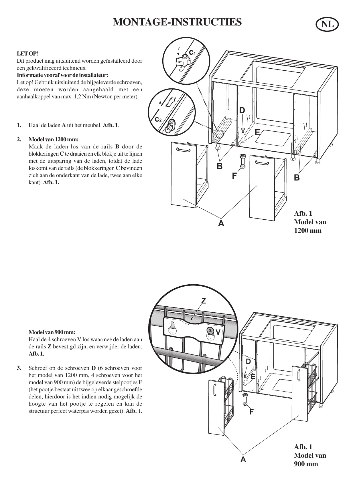 - Schroef op de schroeven D (6 schroeven voor het model van 1200mm , 4 schroeven voor het model van 900mm ) de bijgeleverde stelpootjes F (het pootje bestaat uit twee op elkaar geschroefde delen, hierdoor is het indien nodig möglichk de hoogte van het pootje te regelen en kan de structuur perfect waterpas worden gezet). Afb. 1.