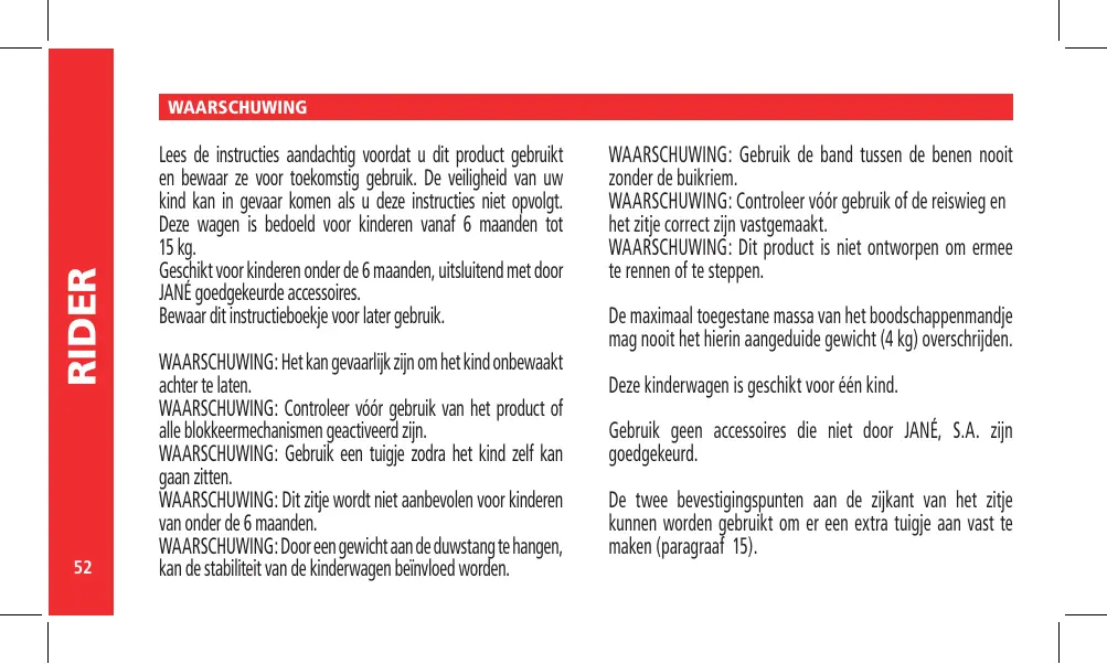 Lees de instructies aandachtig voordat u dit product gebruikt en bewaar ze voor toekomstig gebruik. De veiligheid van uw kind kan in gevaar komen als u deze instructies niet opvolgt. Deze wagen is bedoeld voor kinderen vanaf 6 maanden tot 15 kg. Geschikt voor kinderen onder de 6 maanden, uitsluitend met door JANÉ goedgekeurde accessoires. Bewaar dit instructieboekje voor later gebruik. WAARSCHUWING: Het kan gevaarlijk zijn om het kind onbewaakt achter te laten. WAARSCHUWING: Controleer vóór gebruik van het product of alle blokkeermechanismen geactiveerd zijn. WAARSCHUWING: Gebruik een tuigje zodra het kind zelf kan gaan zitten. WAARSCHUWING: Dit zitje wordt niet aanbevolen voor kinderen van onder de 6 maanden. WAARSCHUWING: Door een gewicht aan de duwstang te hangen, kan de stabiliteit van de kinderwagen beïnvloed worden. WAARSCHUWING: Gebruik de band tussen de benen nooit zonder de buikriem. WAARSCHUWING: Controleer vóór gebruik of de reiswieg en het zitje correct zijn vastgemaakt. WAARSCHUWING: Dit product is niet ontworpen om ermee te rennen of te steppen. De maximaal toegestane massa van het boodschappenmandje mag nooit het hierin aangeduide gewicht (4 kg) overschrijden. Deze kinderwagen is geschikt voor één kind. Gebruik geen accessoires die niet door JANÉ, S.A. zijn goedgekeurd. De twee bevestigingspunten aan de zijkant van het zitje kunnen worden gebruikt om er een extra tuigje aan vast te maken (paragraaf 15). WAARSCHUWING: Laat het kind nooit in de wandelwagen zitten wanneer u trappen op- of afloopt of tijdens het reizen met een vervoermiddel. WAARSCHUWING: Laat het kind nooit op de voetsteun of voetrust gaan staan. WAARSCHUWING: U dient erop toe te zien dat het kind verwijderd blijft van de wandelwagen wanneer deze wordt inen uitgeklapt.Bij het verrichten van deze handelingen is het onvermijdelijk dat er snij- en samendrukkingspunten zijn en dingen vastgeklemd kunnen komen te zitten. WAARSCHUWING: Zorg er na het inschakelen van de rem voor dat de wandelwagen goed is afgeremd. Het kan nodig zijn om de wandelwagen iets te verplaatsen zodat de rem optimaal koppelt. WAARSCHUWING: Leg geen gewicht op de kap. nederlands WAARSCHUWING: Het kind moet verwijderd blijven van de bewegende delen wanneer deze door een verantwoordelijke volwassene worden gemanipuleerd.Bij het verrichten van deze handelingen is het onvermijdelijk dat er snij- en samendrukkingspunten zijn en dingen vastgeklemd kunnen komen te zitten.
