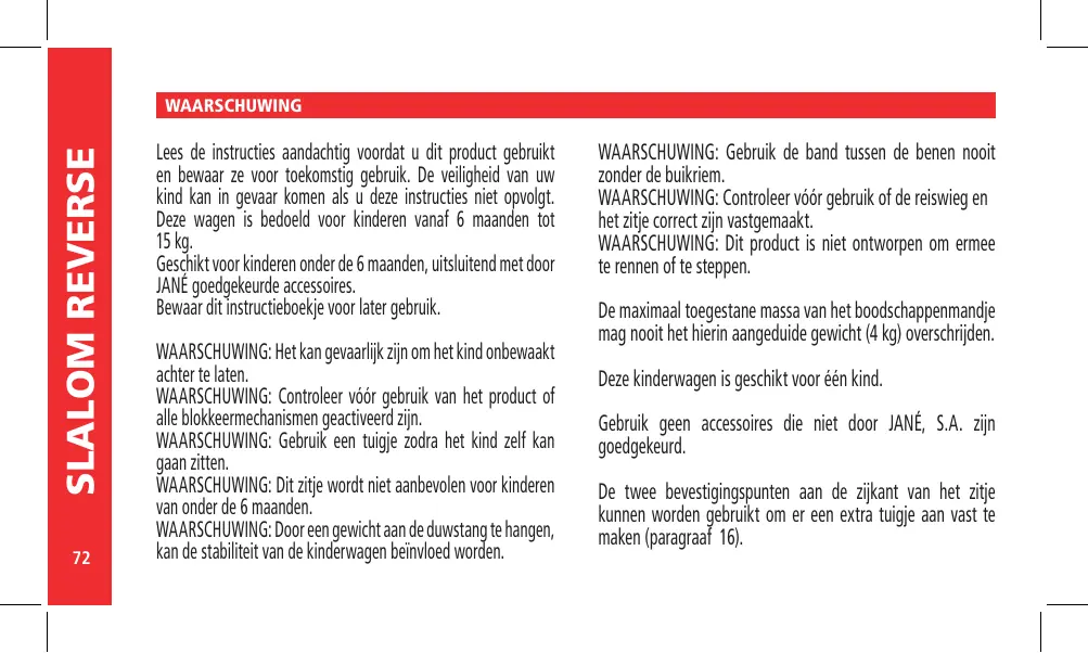 Lees de instructies aandachtig voordat u dit product gebruikt en bewaar ze voor toekomstig gebruik. De veiligheid van uw kind kan in gevaar komen als u deze instructies niet opvolgt. Deze wagen is bedoeld voor kinderen vanaf 6 maanden tot 15 kg. Geschikt voor kinderen onder de 6 maanden, uitsluitend met door JANÉ goedgekeurde accessoires. Bewaar dit instructieboekje voor later gebruik. WAARSCHUWING: Het kan gevaarlijk zijn om het kind onbewaakt achter te laten. WAARSCHUWING: Controleer vóór gebruik van het product of alle blokkeermechanismen geactiveerd zijn. WAARSCHUWING: Gebruik een tuigje zodra het kind zelf kan gaan zitten. WAARSCHUWING: Dit zitje wordt niet aanbevolen voor kinderen van onder de 6 maanden. WAARSCHUWING: Door een gewicht aan de duwstang te hangen, kan de stabiliteit van de kinderwagen beïnvloed worden. WAARSCHUWING: Gebruik de band tussen de benen nooit zonder de buikriem. WAARSCHUWING: Controleer vóór gebruik of de reiswieg en het zitje correct zijn vastgemaakt. WAARSCHUWING: Dit product is niet ontworpen om ermee te rennen of te steppen. De maximaal toegestane massa van het boodschappenmandje mag nooit het hierin aangeduide gewicht (4 kg) overschrijden. Deze kinderwagen is geschikt voor één kind. Gebruik geen accessoires die niet door JANÉ, S.A. zijn goedgekeurd. De twee bevestigingspunten aan de zijkant van het zitje kunnen worden gebruikt om er een extra tuigje aan vast te maken (paragraaf 16). WAARSCHUWING: U dient erop toe te zien dat het kind verwijderd blijft van de wandelwagen wanneer deze wordt inen uitgeklapt.Bij het verrichten van deze handelingen is het onvermijdelijk dat er snij- en samendrukkingspunten zijn en dingen vastgeklemd kunnen komen te zitten. WAARSCHUWING: Laat het kind nooit op de voetsteun of voetrust gaan staan. WAARSCHUWING: Leg geen gewicht op de kap. WAARSCHUWING: Zorg er na het inschakelen van de rem voor dat de wandelwagen goed is afgeremd. Het kan nodig zijn om de wandelwagen iets te verplaatsen zodat de rem optimaal koppelt. nederlands WAARSCHUWING: Het kind moet verwijderd blijven van de bewegende delen wanneer deze door een verantwoordelijke volwassene worden gemanipuleerd.Bij het verrichten van deze handelingen is het onvermijdelijk dat er snij- en samendrukkingspunten zijn en dingen vastgeklemd kunnen komen te zitten. WAARSCHUWING: Laat het kind nooit in de wandelwagen zitten wanneer u trappen op- of afloopt of tijdens het reizen met een vervoermiddel.