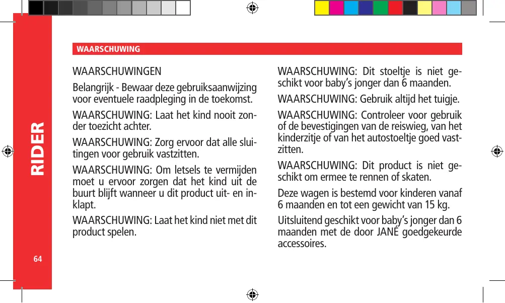 14.- ONDERHOUD Stel de bekleding niet langdurig bloot aan de zon. Was de plastic onderdelen met lauw water en zeep en droog alle onderdelen daarna zorgvuldig af. Controleer regelmatig de remmen, tuigjes en bevestigingen op schade of slijtage door gebruik. Vergeet niet om de rem regelmatig bij te stellen volgens de methode die wordt uitgelegd in afbeelding. 18 Het is zowel voor uw veiligheid als voor het goede behoud van dit product belangrijk dat u het regelmatig na laat kijken in een van onze officiële werkplaatsen. 15.- REGENHOES De regenhoes van uw RIDER is zeer gemakkelijk om aan te brengen. U hoeft alleen de zitting maar te bedekken en de haakjes aan het frame vast te maken. De regenhoes heeft een klein raampje die opgerold en met klittenband vastgemaakt kan worden zodat het kind ongedwongen rond kan kijken. 21 Dit artikel heeft een garantie zoals bepaald in de wet 23/2003 van 10 juli. Bewaar de aankoopbon. Deze moet in de winkel waar u het product heeft gekocht worden getoond om bij klachten de geldigheid ervan te rechtvaardigen. Defecten en storingen veroorzaakt door onjuist gebruik van het artikel of de niet-naleving van de onderhouds- en veiligheidsnormen die in de instructiebladen en de wasetiketten staan vermeld, alsmede elementen die door normaal gebruik en dagelijkse hantering verslijten, vallen buiten deze garantie. Het etiket met het chassisnummer van uw model mag onder geen beding worden verwijderd, want het bevat belangrijke informatie. Opgelet: Voor de maximale veiligheid en zorg ten aanzien van uw nieuwe JANÉ product is het erg belangrijk dat u de registratiekaart invult die op de website www.jane.es is te vinden. nederlands