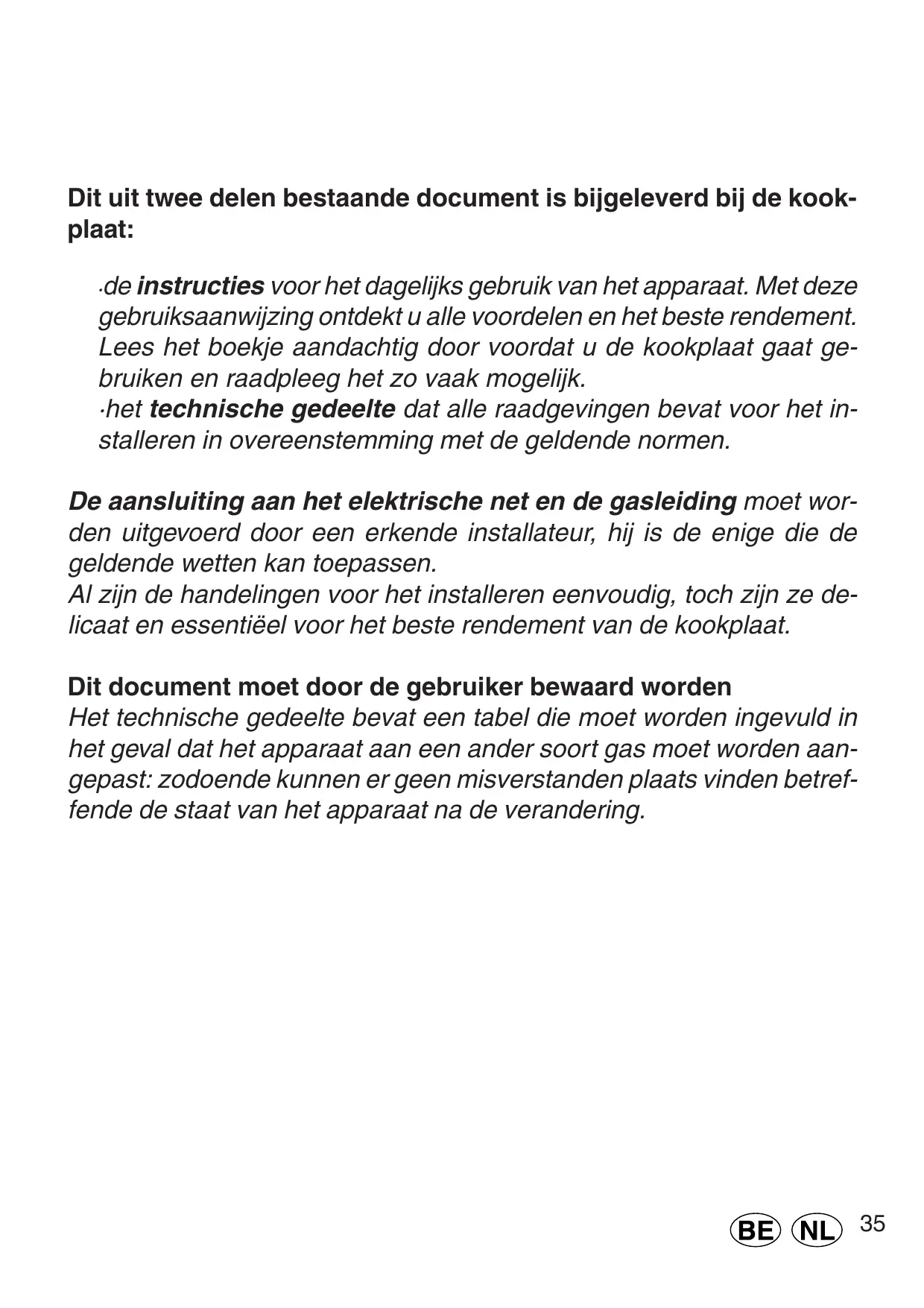 - het technische gedeelte dat alle raadgevingen bevat voor het installeren in overeenstemming met de geldende normen. De aansluiting aan het elektrische net en de gasleiding moet worden uitgevoerd door een erkende installateur, hij is de enige die de geldende wetten kan toepassen. Al zijn de handelingen voor het installeren eenvoudig, toch zijn ze delicaat en essentiëel voor het beste rendement van de kookplaat. Dit document moet door de gebruiker bewaard worden Het technische gedeelte bevat een tabel die moet worden ingevuld in het geval dat het apparaat aan een ander soort gas moet worden aangepast: zodoende kunnen er geen misverstanden plaats vinden betreffende de staat van het apparaat na de verandering.