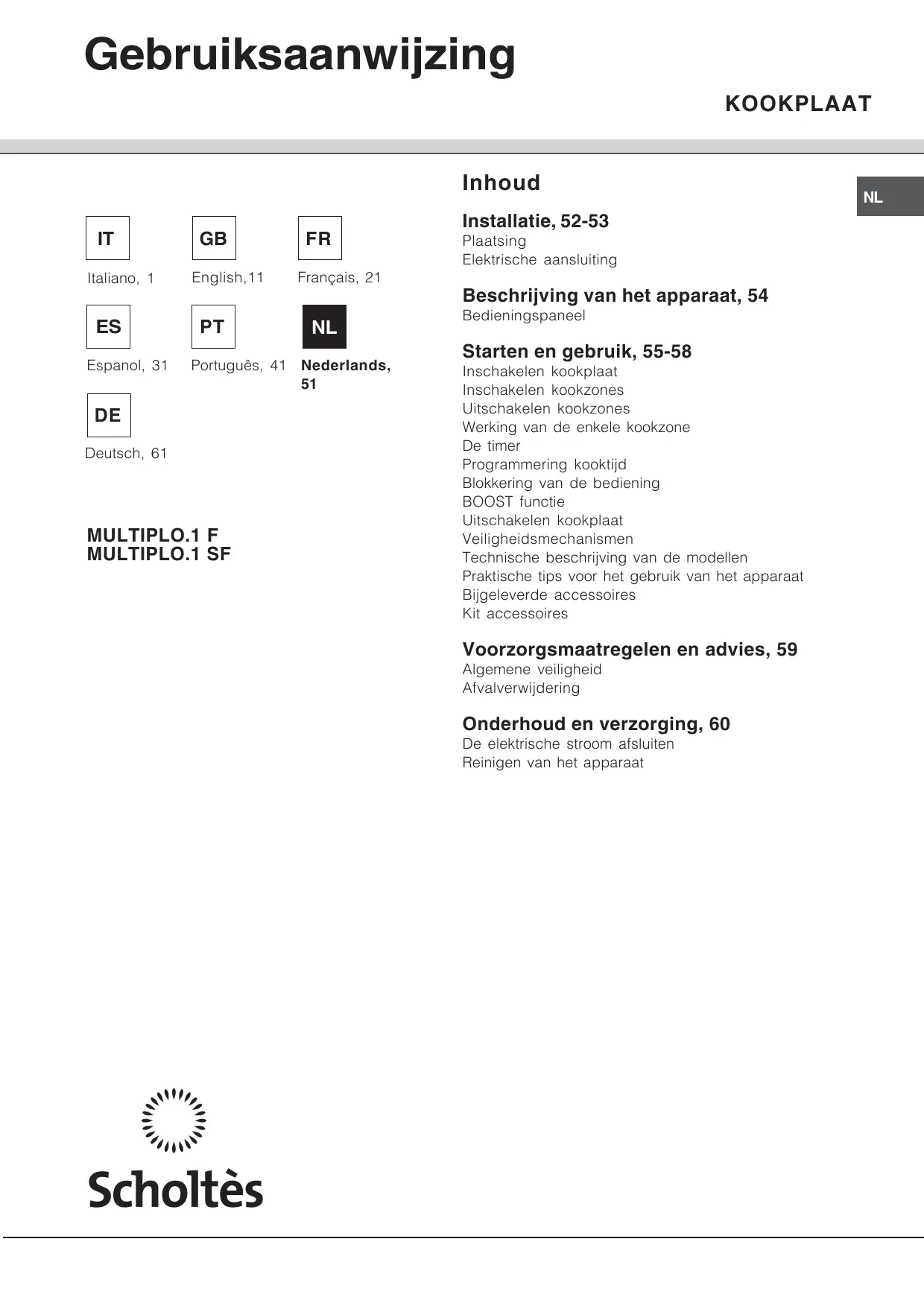 Deutsch, 61 MULTIPLO.1 F MULTIPLO.1 SF Installatie, 52-53 Plaatsing Elektrische aansluiting Beschrijving van het apparaat, 54 Bedieningspaneel Starten en gebruik, 55-58 Inschakelen kookplaat Inschakelen kookzones Uitschakelen kookzones Werking van de enkele kookzone De timer Programmering kooktijd Blokkering van de bediening BOOST functie Uitschakelen kookplaat Veiligheidsmechanismen Technische beschrijving van de modellen Praktische tips voor het gebruik van het apparaat Bijgeleverde accessoires Kit accessoires Voorzorgsmaatregelen en advies, 59 Algemene veiligheid Afvalverwijdering Onderhoud en verzorging, 60 De elektrische stroom afsluiten Reinigen van het apparaat