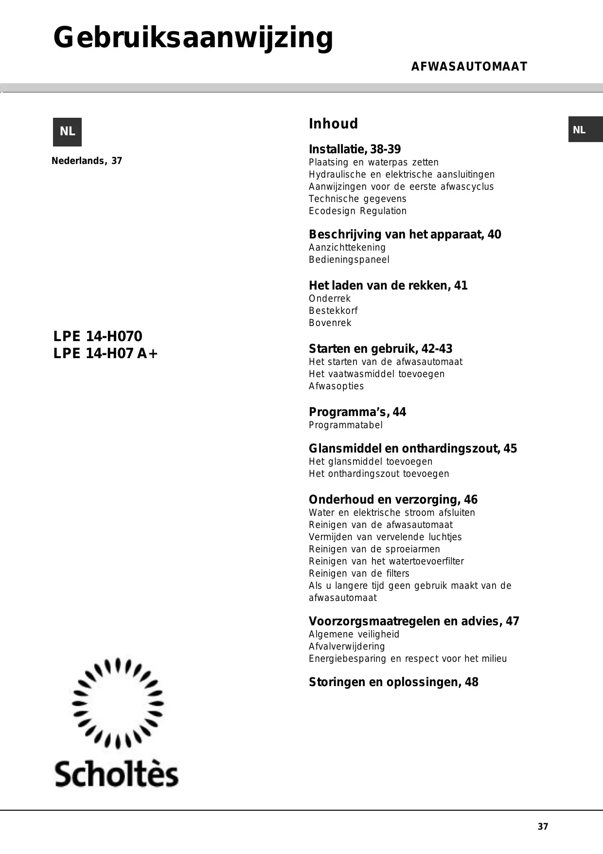 LPE 14-H070 IX - Vaatwassers SCHOLTES - Gratis gebruiksaanwijzing en handleiding