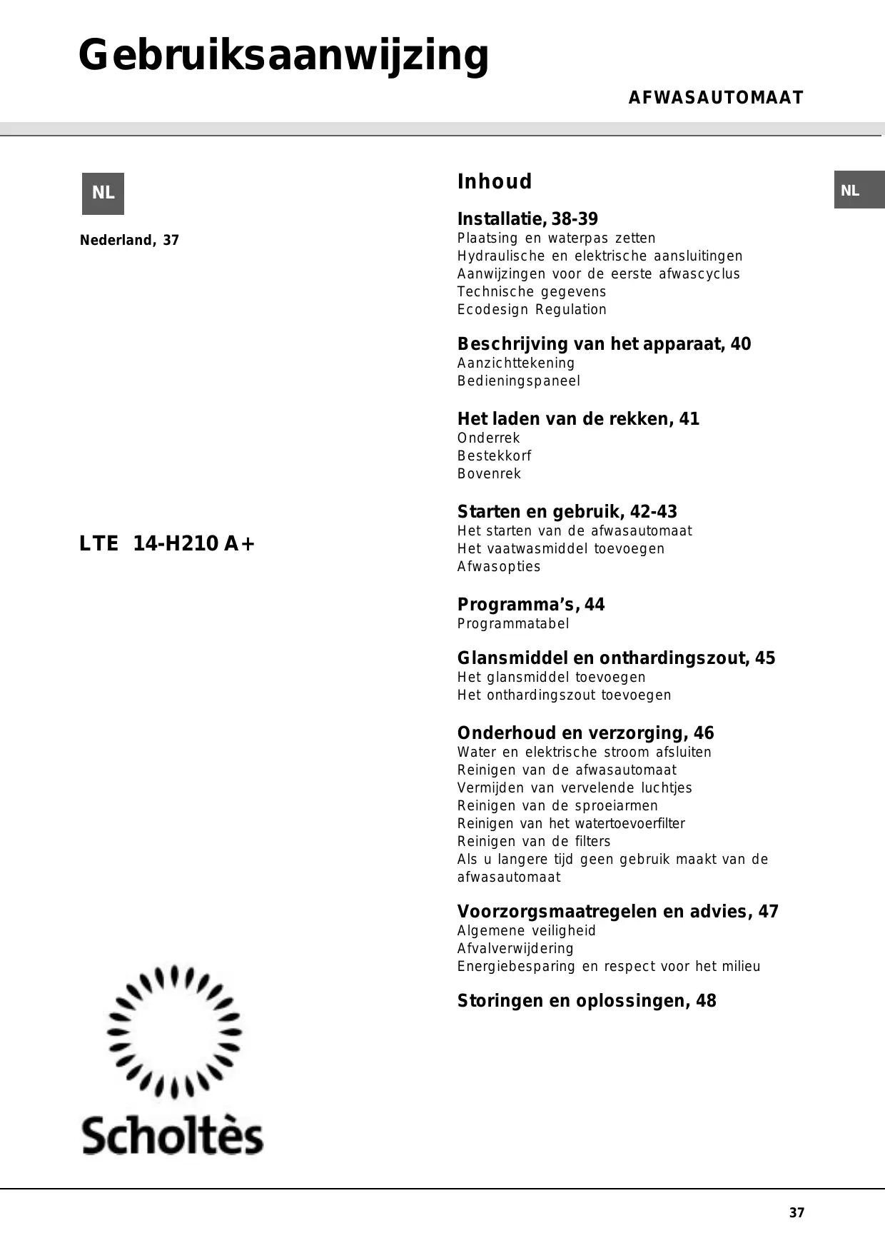 Installatie, 38-39 Nederland, 37 Plaatsing en waterpas zetten Hydraulische en elektrische aansluitingen Aanwijzingen voor de eerste afwascyclus Technische gegevens Ecodesign Regulation Beschrijving van het apparaat, 40 Aanzichttekening Bedieningspaneel Het laden van de rekken, 41 Onderrek Bestekkorf Bovenrek Starten en gebruik, 42-43