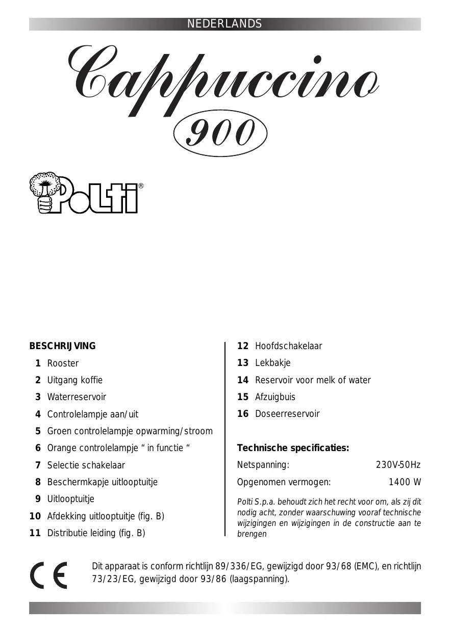 - For a richer coffee, use mineral water instead of tap water. ENGLISH GUARANTEE POLTI CAPPUCCINO is guaranteed to the original purchaser for one year from purchase date against manufacturing or raw material defects. The guarantee is not valid if the appliance has been misused in any way or if the instructions have not been adhered to. In case of damage or malfunctioning, contact the nearest authorised Help Centre. Unauthorised alterations or repairs to the machine will automatically invalidate this guarantee. POLTI S.p.A. declines any responsibility in case of accidents arising from using the CAPPUCCINO 900 maker in ways not complying with the instructions contained herein. ATTENTION The appliance is built according to the current recycling rules. It is recommended not to throw away the transport protection packing materials, but take them to the relevant collection centre. TROUBLESHOOTING TROUBLE CAUSE SOLUTION Turbulent dispensing with steam output The milk or water are not cold enough Use milk or water at refrigerator temperature (about 10 °C) The operation cycle does not start The coffee slide (2) is not in the right position Put the slide in its place In the dispensing phase you can hear some noise but the drink does not come out The water container (3) is empty or badly positioned Check the water level and correctly position the container ATTENTION! For each coffee please pour one single coffee dose with the measure (16) (fig. F). NEDERLANDS Cappuccino BESCHRIJVING 12 Hoofdschakelaar 1 Rooster 13 Lekbakje 2 Uitgang koffie 14 Reservoir voor melk of water 3 Waterreservoir 15 Afzuigbuis 4 Controlelampje aan/uit 16 Doseerreservoir 5 Groen controlelampje opwarming/stroom 6 Orange controlelampje “ in functie “ Technische specificaties: 7 Selectie schakelaar Netspanning: 8 Beschermkapje uitlooptuitje Opgenomen vermogen: 9 Uitlooptuitje Polti S.p.a. behoudt zich het recht voor om, als zij dit nodig acht, zonder waarschuwing vooraf technische wijzigingen en wijzigingen in de constructie aan te brengen 10 Afdekking uitlooptuitje (fig. B) 11 Distributie leiding (fig. B) 230V-50Hz 1400 W Dit apparaat is conform richtlijn 89/336/EG, gewijzigd door 93/68 (EMC), en richtlijn 73/23/EG, gewijzigd door 93/86 (laagspanning). NEDERLANDS GEBRUIKSVOORSCHRIFTEN Opgelet ! Lees de gebruiksaanwijzing voor het gebruiken van het apparaat.